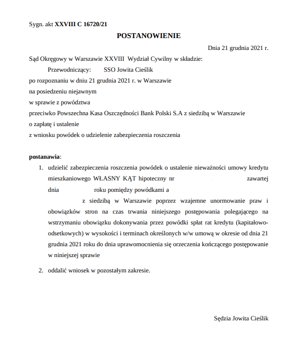 Sąd Okręgowy w Warszawie w składzie SSO Jowita Cieślik po rozpoznaniu w dniu 21 grudnia 2021 r. na posiedzeniu niejawnym sprawy z powództwa naszych Klientów przeciwko Powszechna Kasa Oszczędności Bank Polski S.A. z siedzibą w Warszawie o ustalenie i zapłatę, sygn. akt. XXVIII C 16720/21, postanowił udzielić zabezpieczenia roszczenia o ustalenie nieważności umowy kredytu hipotecznego.
