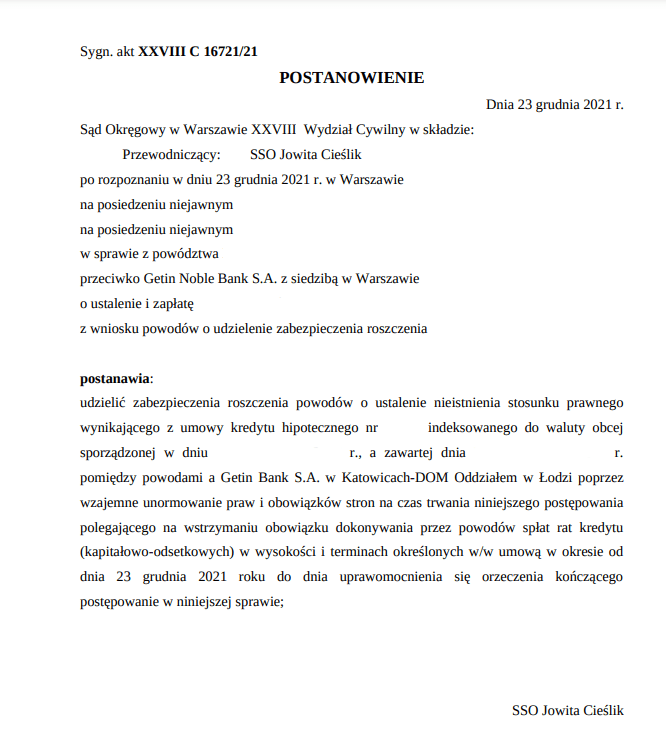 Sąd Okręgowy w Warszawie w składzie SSO Jowita Cieślik po rozpoznaniu w dniu 23 grudnia 2021 r. na posiedzeniu niejawnym sprawy z powództwa naszych Klientów przeciwko Getin Noble Bank S.A. z siedzibą w Warszawie o ustalenie i zapłatę, sygn. akt. XXVIII C 16721/21, postanowił udzielić zabezpieczenia roszczenia o ustalenie nieważności umowy kredytu hipotecznego.