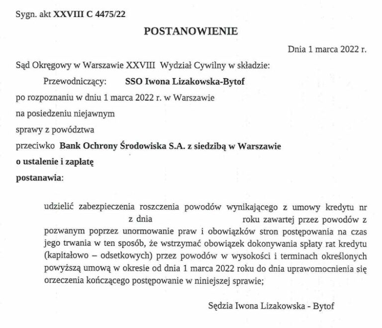 Sąd Okręgowy w Warszawie w składzie SSO Iwona Lizakowska-Bytof po rozpoznaniu w dniu 1 marca 2022 r. na posiedzeniu niejawnym z powództwa naszych Klientów przeciwko Bankowi Ochrony Środowiska S.A z siedzibą w Warszawie o ustalenie i zapłatę, sygn. akt XXVIII C 4475/22, postanowił udzielić zabezpieczenia roszczenia o ustalenie nieważności umowy kredytu hipotecznego.