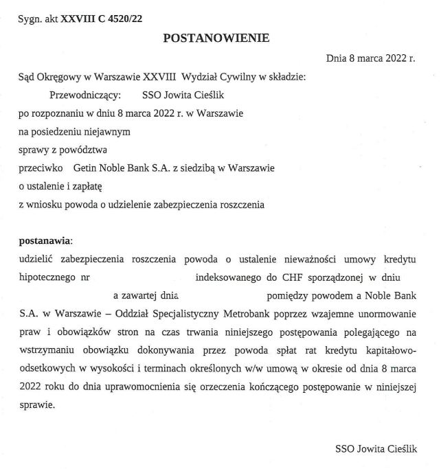 Sąd Okręgowy w Warszawie w składzie SSO Jowita Cieślik po rozpoznaniu w dniu 8 marca 2022 r. na posiedzeniu niejawnym z powództwa naszego Klienta przeciwko Getin Noble Bankowi S.A. z siedzibą w Warszawie o ustalenie i zapłatę, sygn. akt XXVIII C 4520/22, postanowił udzielić zabezpieczenia roszczenia o ustalenie nieważności umowy kredytu hipotecznego.