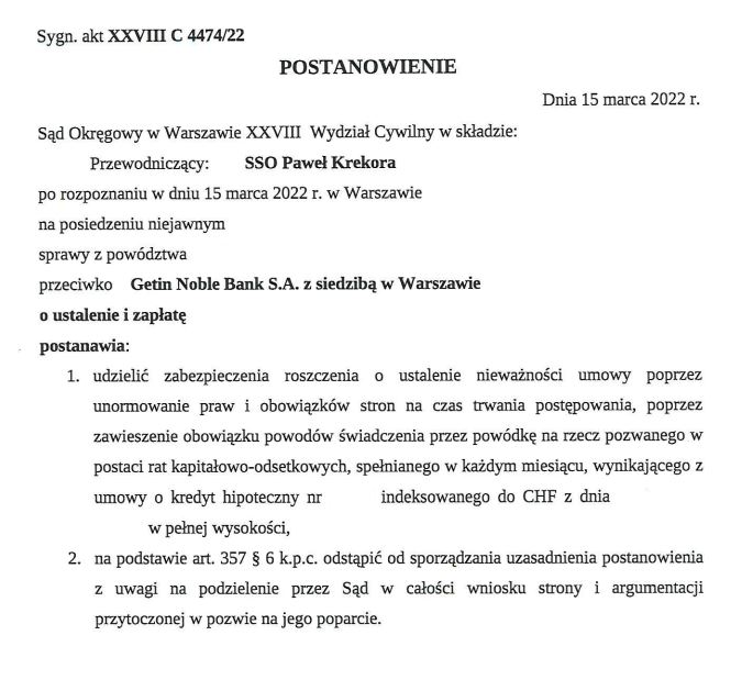 Sąd Okręgowy w Warszawie w składzie SSO Paweł Krekora po rozpoznaniu w dniu 15 marca 2022 r. na posiedzeniu niejawnym z powództwa naszej Klientki przeciwko Getin Noble Bankowi S.A. z siedzibą w Warszawie o ustalenie i zapłatę, sygn. akt XXVIII C 4474/22, postanowił udzielić zabezpieczenia roszczenia o ustalenie nieważności umowy kredytu hipotecznego.