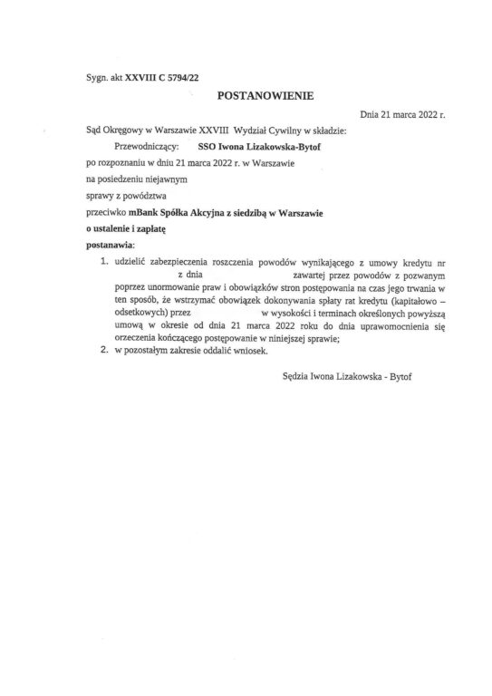 Sąd Okręgowy w Warszawie w składzie SSO Iwona Lizakowska-Bytof po rozpoznaniu w dniu 21 marca 2022 r. na posiedzeniu niejawnym z powództwa naszych Klientów przeciwko mBank S.A. z siedzibą w Warszawie o ustalenie i zapłatę, sygn. akt XXVIII C 5794/22, postanowił udzielić zabezpieczenia roszczenia o ustalenie nieważności umowy kredytu hipotecznego.