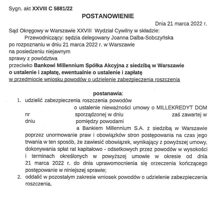 Sąd Okręgowy w Warszawie w składzie SSR del. Joanna Dalba-Sobczyńska po rozpoznaniu w dniu 21 marca 2022 r. na posiedzeniu niejawnym z powództwa naszych Klientów przeciwko Bankowi Millennium S.A. z siedzibą w Warszawie o ustalenie i zapłatę, sygn. akt XXVIII C 5881/22, postanowił udzielić zabezpieczenia roszczenia o ustalenie nieważności umowy kredytu hipotecznego.