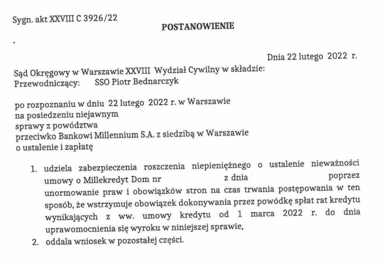 Sąd Okręgowy w Warszawie w składzie SSR del. Tomasz Leszczyński po rozpoznaniu w dniu 23 lutego 2022 r. na posiedzeniu niejawnym z powództwa naszego Klienta przeciwko Bankowi Millennium S.A. z siedzibą w Warszawie o ustalenie i zapłatę, sygn. akt XXVIII C 3013/22, postanowił udzielić zabezpieczenia roszczenia o ustalenie nieważności umowy kredytu hipotecznego.