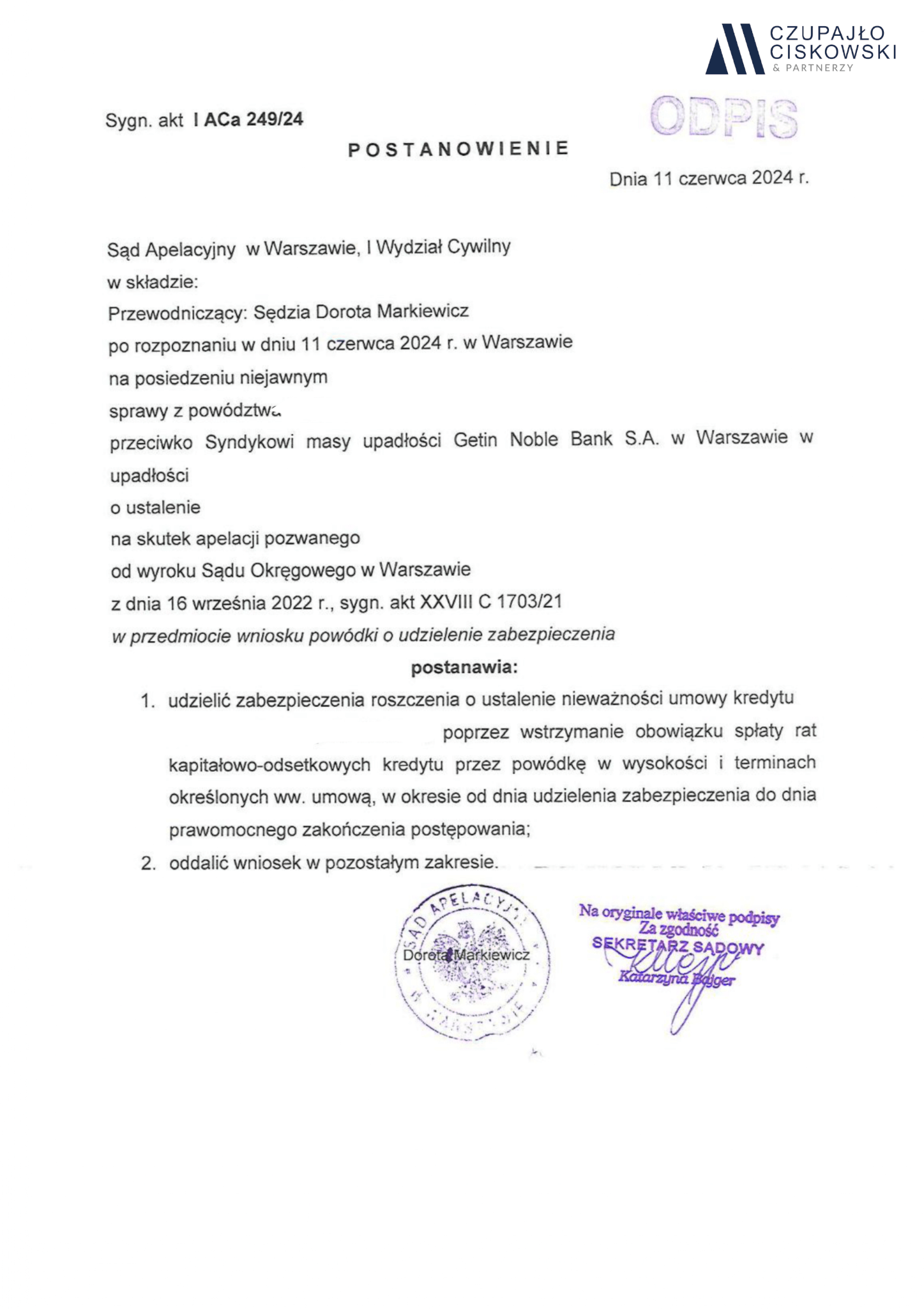 Sąd Apelacyjny w Warszawie, I Wydział Cywilny w składzie Sędzia Dorota Markiewicz po rozpoznaniu na posiedzeniu niejawnym w dniu 11 czerwca 2024 r. sprawy z powództwa naszej Klientki przeciwko Syndykowi Masy Upadłości Getin Noble Bank S.A. w upadłości z siedzibą w Warszawie o ustalenie i zapłatę w sprawie o sygn. akt I ACa 249/24 postanowił udzielić zabezpieczenia roszczenia naszej Klientce.