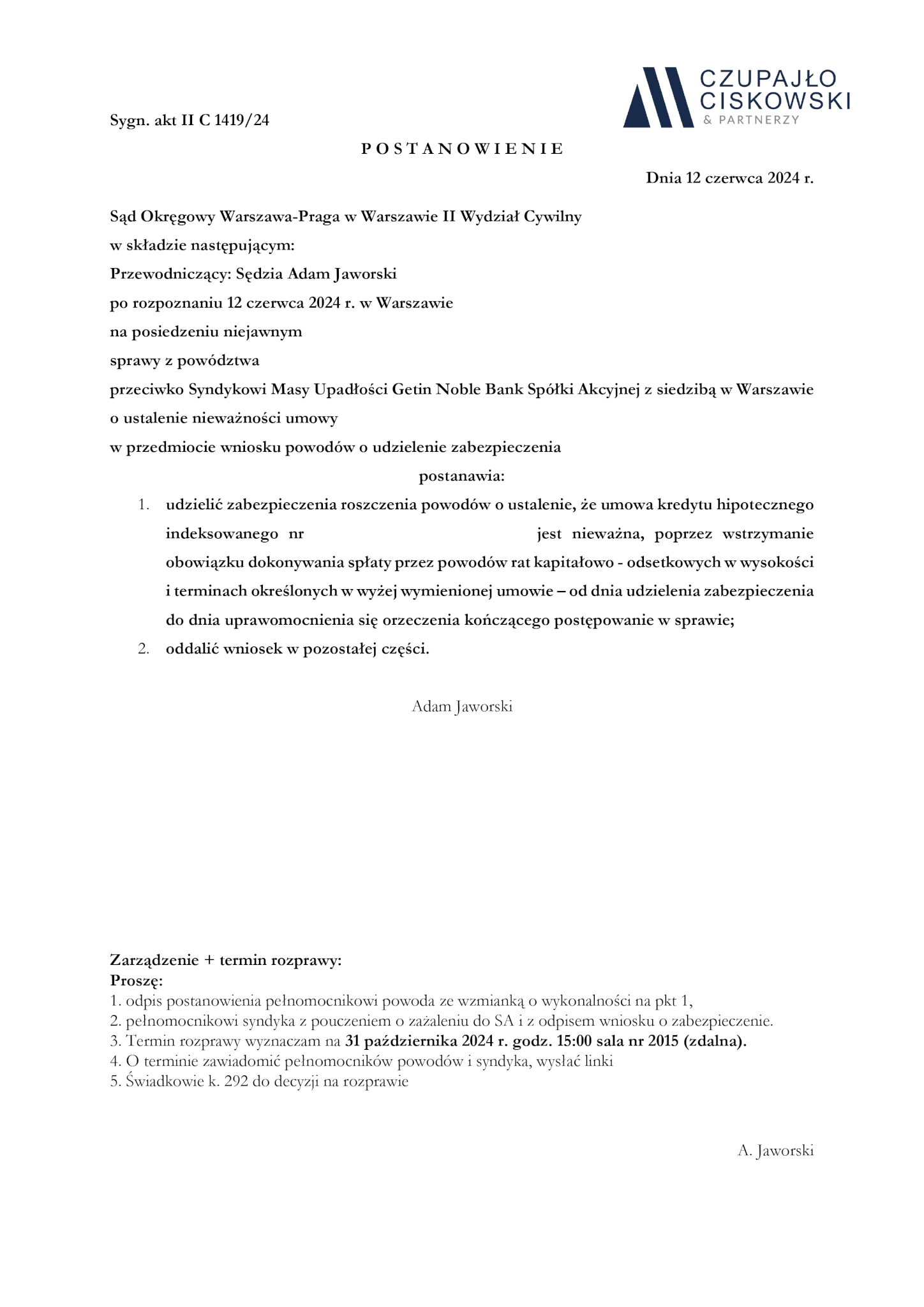 Sąd Okręgowy Warszawa-Praga w Warszawie, II Wydział Cywilny w składzie Sędzia Adam Jaworski po rozpoznaniu na posiedzeniu niejawnym w dniu 12 czerwca 2024 r. sprawy z powództwa naszych Klientów przeciwko Syndykowi Masy Upadłości Getin Noble Bank S.A. w upadłości z siedzibą w Warszawie o ustalenie w sprawie o sygn. akt II C 1419/24 postanowił udzielić zabezpieczenia roszczenia naszych Klientów.