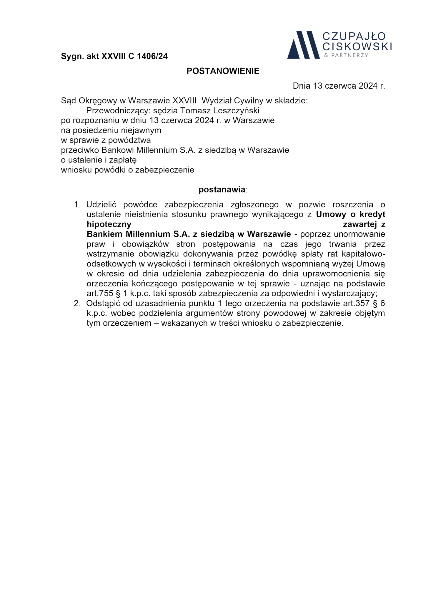 Sąd Okręgowy w Warszawie, XXVIII Wydział Cywilny w składzie Sędzia Tomasz Leszczyński po rozpoznaniu na posiedzeniu niejawnym w dniu 13 czerwca 2024 r. sprawy z powództwa naszej Klientki przeciwko Bankowi Millennium S.A. z siedzibą w Warszawie o ustalenie i zapłatę w sprawie o sygn. akt XXVIII C 1406/24 postanowił udzielić zabezpieczenia roszczenia naszej Klientki.
