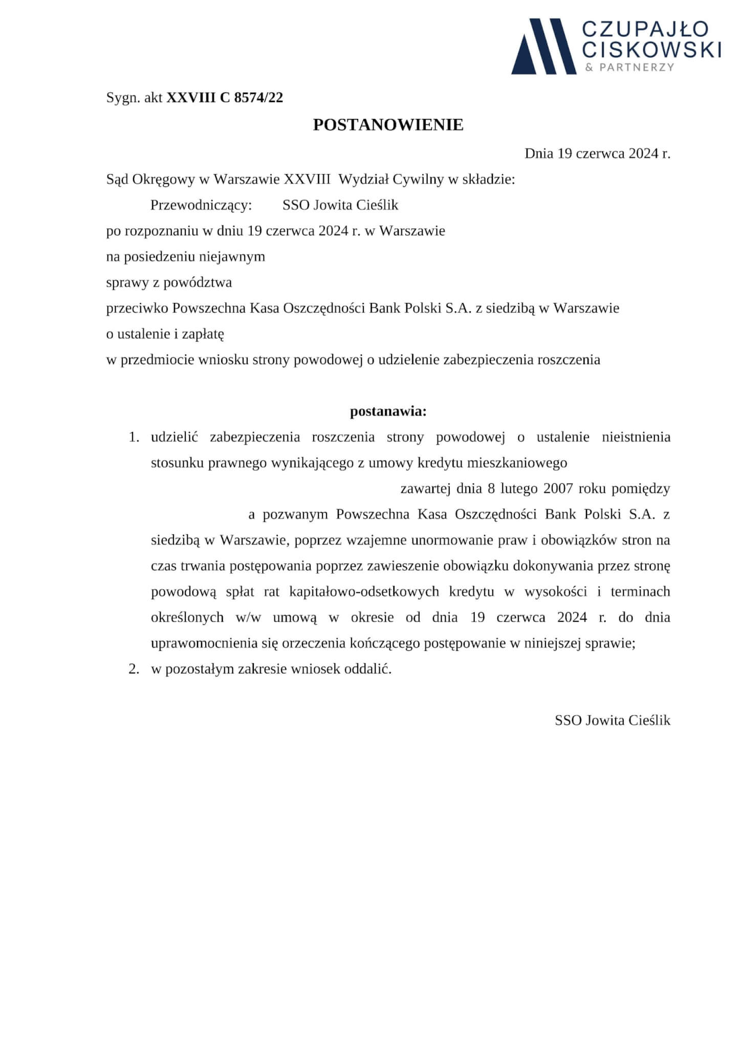 Sąd Okręgowy w Warszawie, XXVIII Wydział Cywilny w składzie Sędzia Jowita Cieślik po rozpoznaniu na posiedzeniu niejawnym w dniu 19 czerwca 2024 r. sprawy z powództwa naszej Klientki przeciwko Powszechnej Kasie Oszczędności Bank Polski S.A. z siedzibą w Warszawie o ustalenie i zapłatę w sprawie o sygn. akt XXVIII C 8574/22 postanowił udzielić zabezpieczenia roszczenia naszej Klientki.