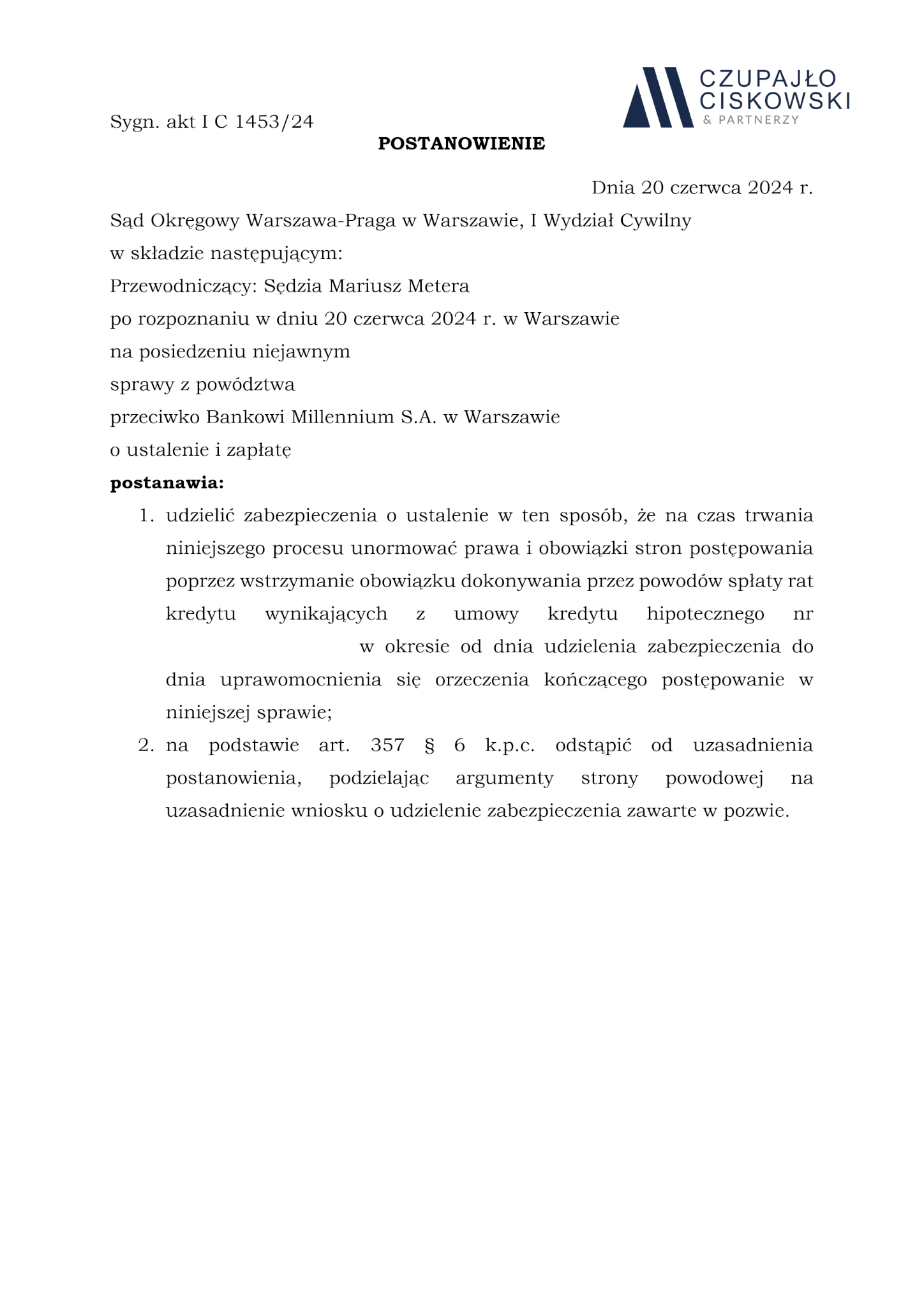 Sąd Okręgowy Warszawa-Praga w Warszawie, I Wydział Cywilny w składzie Sędzia Mariusz Metera po rozpoznaniu na posiedzeniu niejawnym w dniu 20 czerwca 2024 r. sprawy z powództwa naszych Klientów przeciwko Bankowi Millennium S.A. z siedzibą w Warszawie o ustalenie i zapłatę w sprawie o sygn. akt I C 1453/24 postanowił udzielić zabezpieczenia roszczenia naszych Klientów.