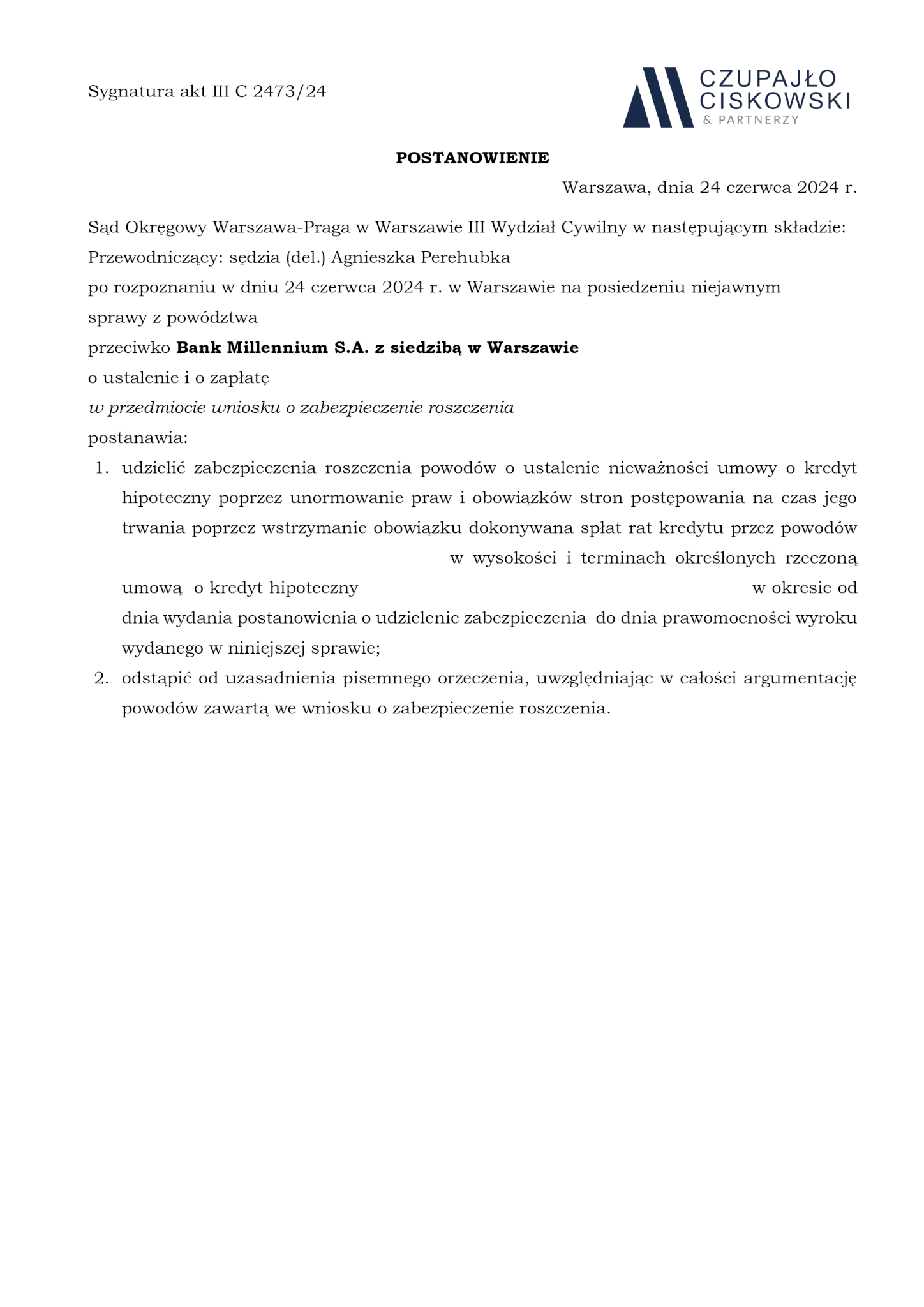 Sąd Okręgowy Warszawa-Praga w Warszawie, III Wydział Cywilny w składzie Sędzia Agnieszka Perehubka po rozpoznaniu na posiedzeniu niejawnym w dniu 24 czerwca 2024 r. sprawy z powództwa naszych Klientów przeciwko Bankowi Millennium S.A. z siedzibą w Warszawie o ustalenie i zapłatę w sprawie o sygn. akt III C 2473/24 postanowił udzielić zabezpieczenia roszczenia naszych Klientów.