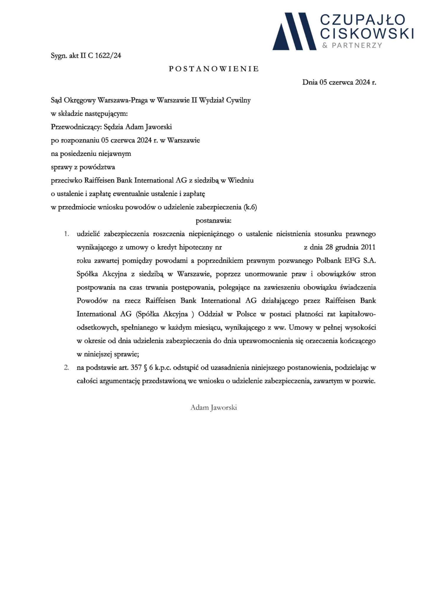 Sąd Okręgowy Warszawa-Praga w Warszawie, II Wydział Cywilny w składzie SSO Adam Jaworski po rozpoznaniu na posiedzeniu niejawnym, w dniu 5 czerwca 2024 r. sprawy z powództwa naszych Klientów przeciwko Raiffeisen Bank International AG o ustalenie i zapłatę o sygn. akt II C 1622/24 postanowił udzielić zabezpieczenia roszczenia naszych Klientów.