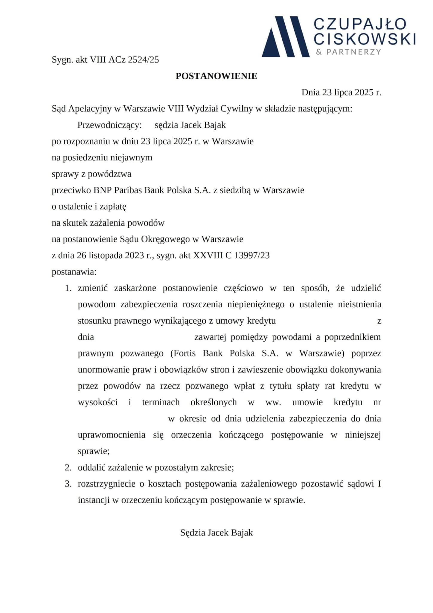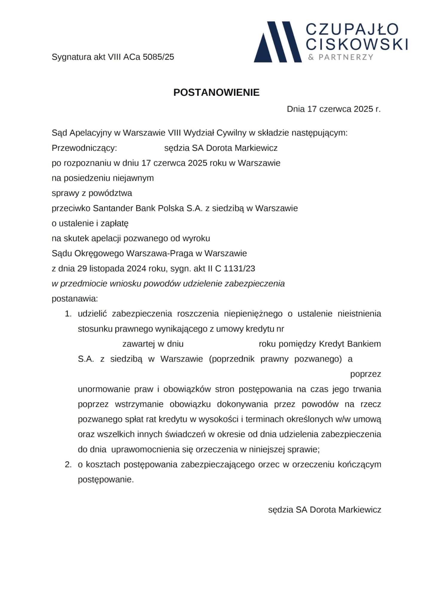 Sąd Apelacyjny w Warszawie, VIII Wydział Cywilny w składzie sędzia SA Dorota Markiewicz po rozpoznaniu na posiedzeniu niejawnym w dniu 17 czerwca 2025 r. sprawy z powództwa naszych Klientów przeciwko Santander Bank Polska S.A. z siedzibą w Warszawie o ustalenie i zapłatę w sprawie o sygn. akt VIII ACa 5085/25postanowił udzielić zabezpieczenia roszczenia naszym Klientom.