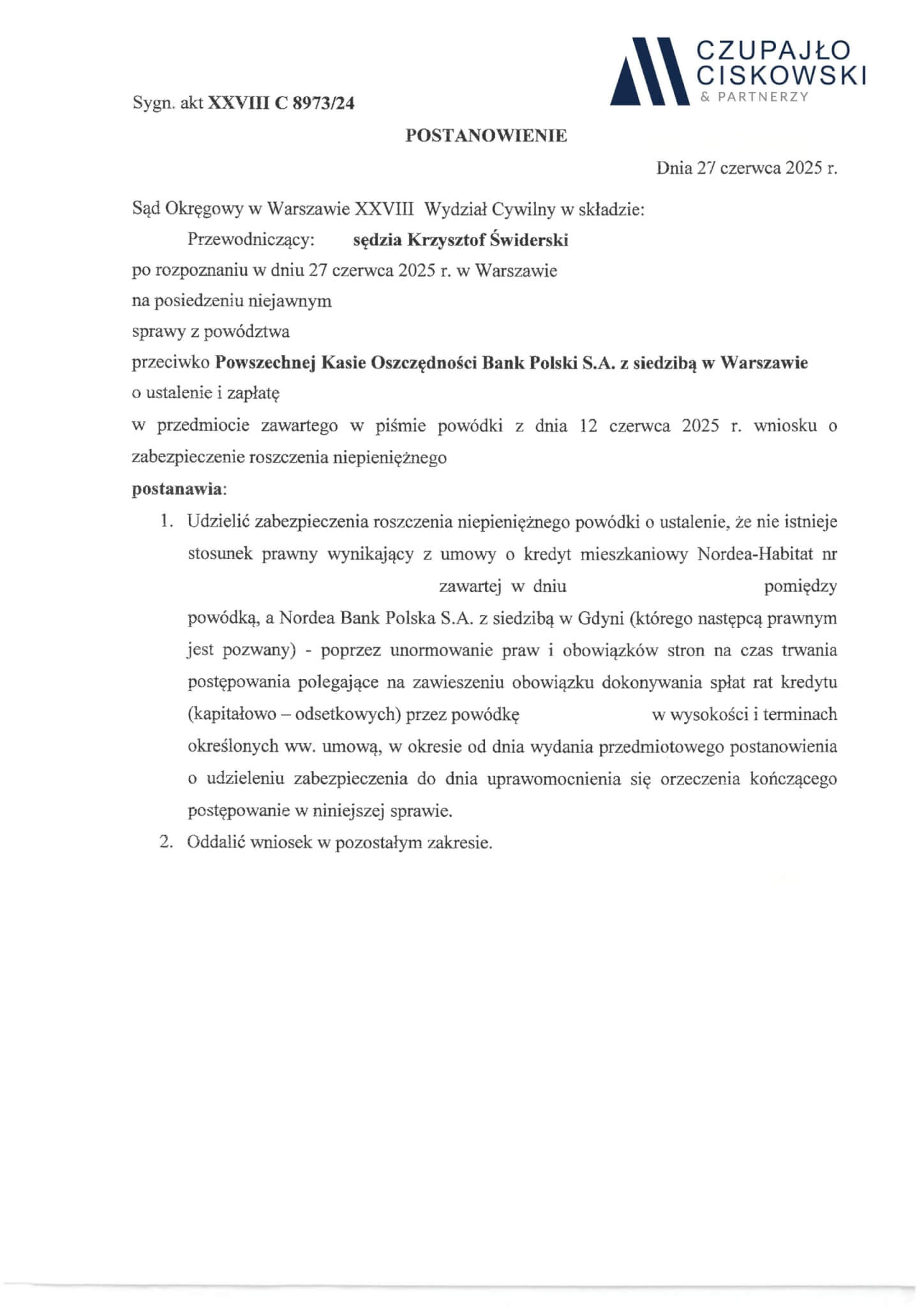Sąd Okręgowy w Warszawie, XXVIII Wydział Cywilny w Sędzia Krzysztof Świderski po rozpoznaniu na posiedzeniu niejawnym w dniu 17 lipca 2025 r. sprawy z powództwa naszych Klientów przeciwko Powszechnej Kasie Oszczędności Bank Polski S.A. z siedzibą w Warszawie o ustalenie i zapłatę w sprawie o sygn. akt XXVIII C 8973/24 postanowił udzielić zabezpieczenia roszczenia naszym Klientom.