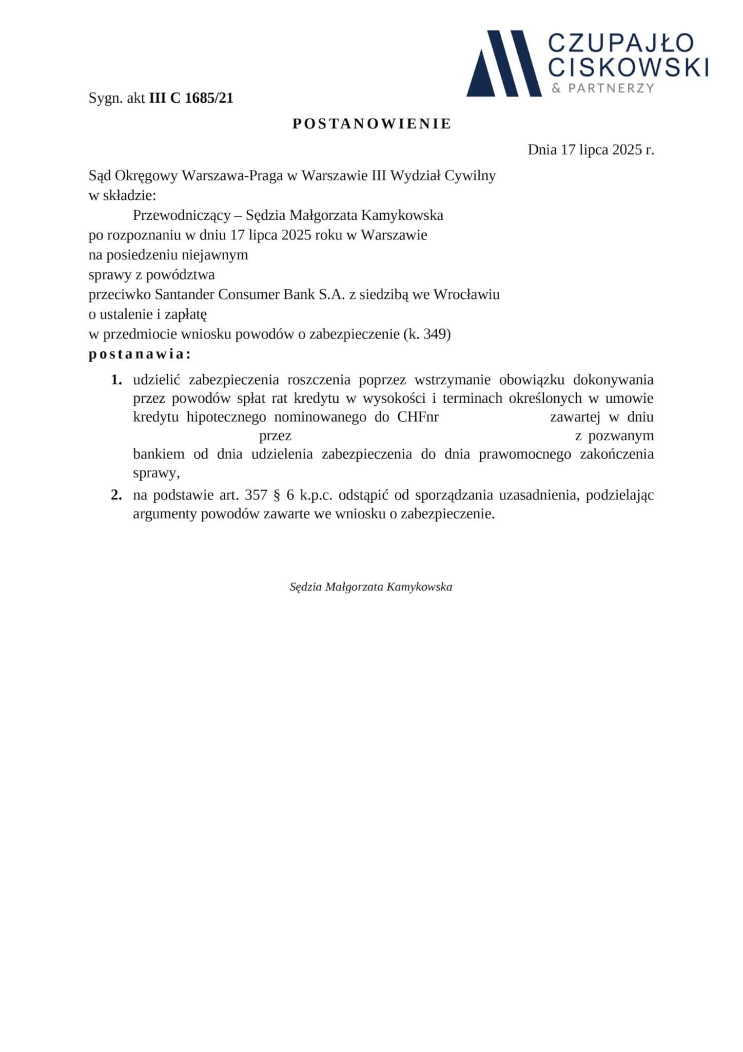 Sąd Okręgowy Warszawa-Praga w Warszawie, III Wydział Cywilny w Sędzia Małgorzata Kamykowska po rozpoznaniu na posiedzeniu niejawnym w dniu 17 lipca 2025 r. sprawy z powództwa naszych Klientów przeciwko Santander Consumer Bank S.A. z siedzibą we Wrocławiu o ustalenie i zapłatę w sprawie o sygn. akt III C 1685/21 postanowił udzielić zabezpieczenia roszczenia naszym Klientom.
