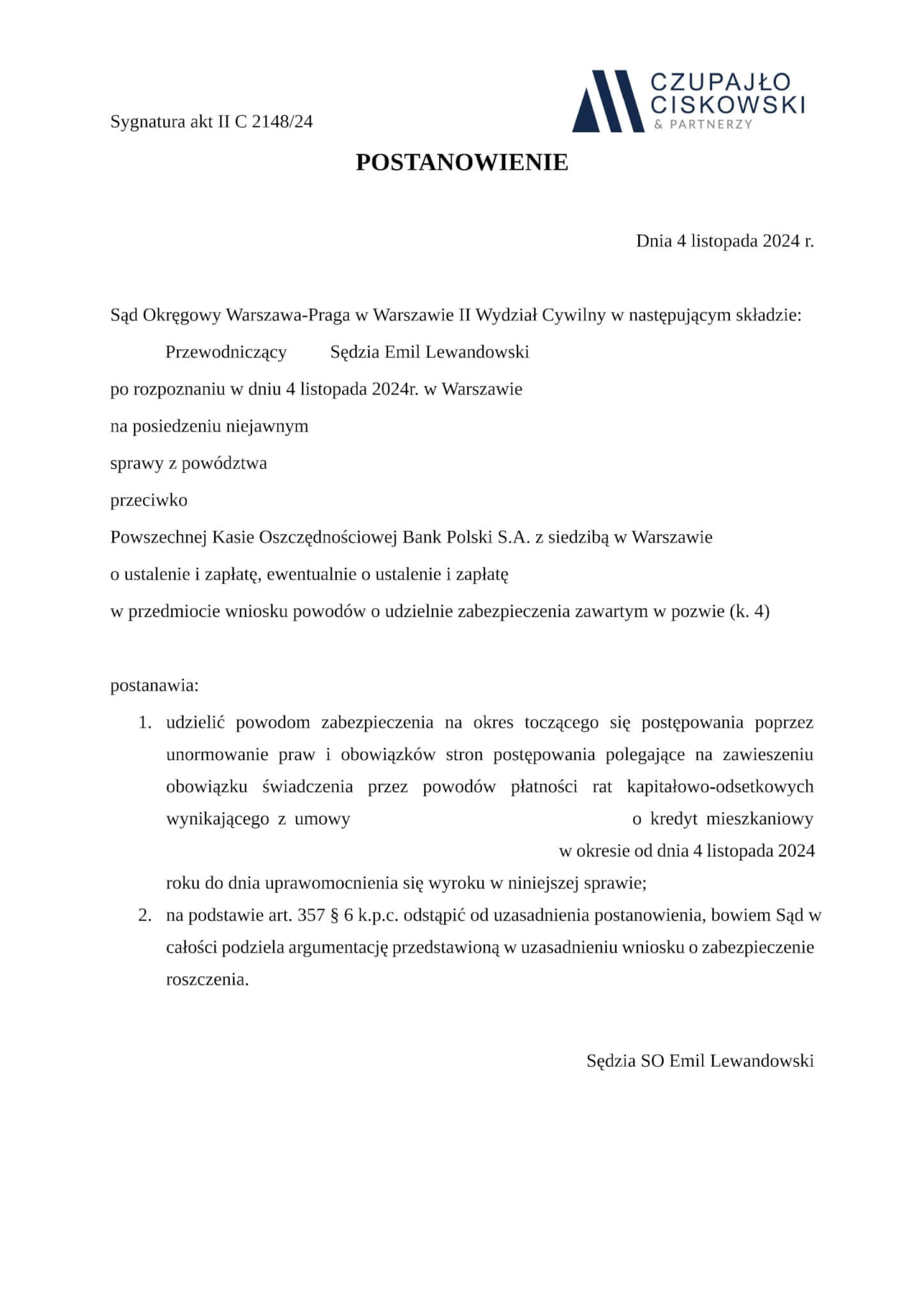 Sąd Okręgowy Warszawa-Praga w Warszawie, II Wydział Cywilny po rozpoznaniu na posiedzeniu niejawnym w dniu 4 listopada 2024 r. sprawy z powództwa naszych klientów przeciwko Powszechnej Kasie Oszczędności Bank Polski S.A. z siedzibą w Warszawie o ustalenie i zapłatę w sprawie o sygn. akt II C 2148/24 postanowił udzielić zabezpieczenia roszczenia naszych klientów.