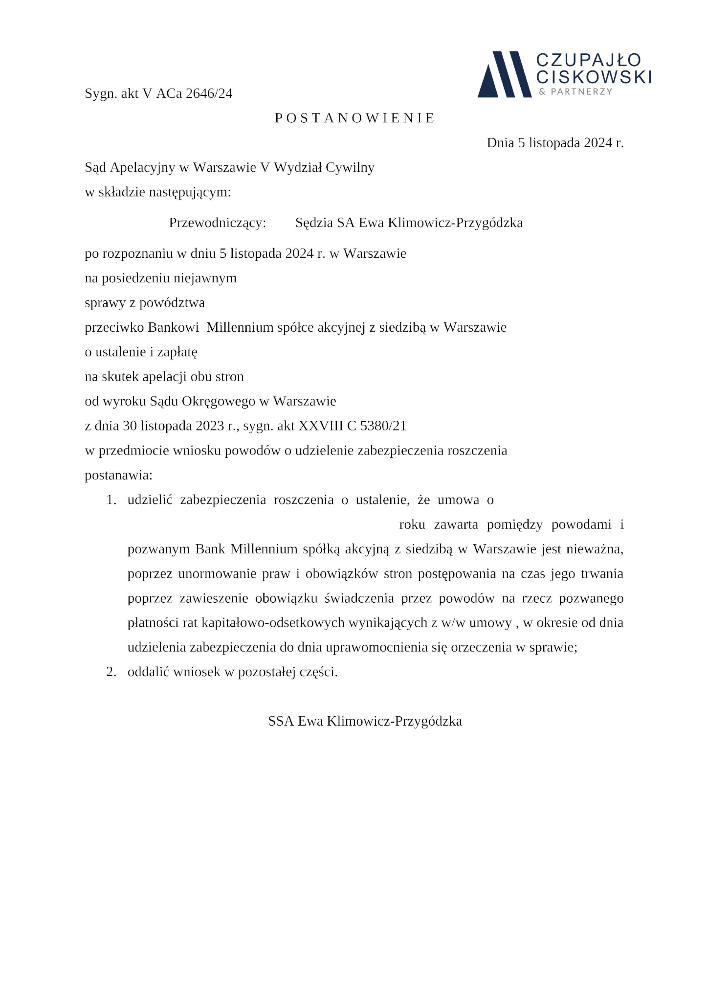 Sąd Apelacyjny w Warszawie, V Wydział Cywilny w składzie Przewodniczący: Sędzia SA Ewa Klimowicz-Przygódzka po rozpoznaniu na posiedzeniu niejawnym w dniu 5 listopada 2024 r. sprawy z powództwa naszych Klientów przeciwko Bankowi Millennium S.A. z siedzibą w Warszawie o ustalenie i zapłatę w sprawie o sygn. akt V ACa 2646/24 postanowił udzielić zabezpieczenia roszczenia naszym klientom.