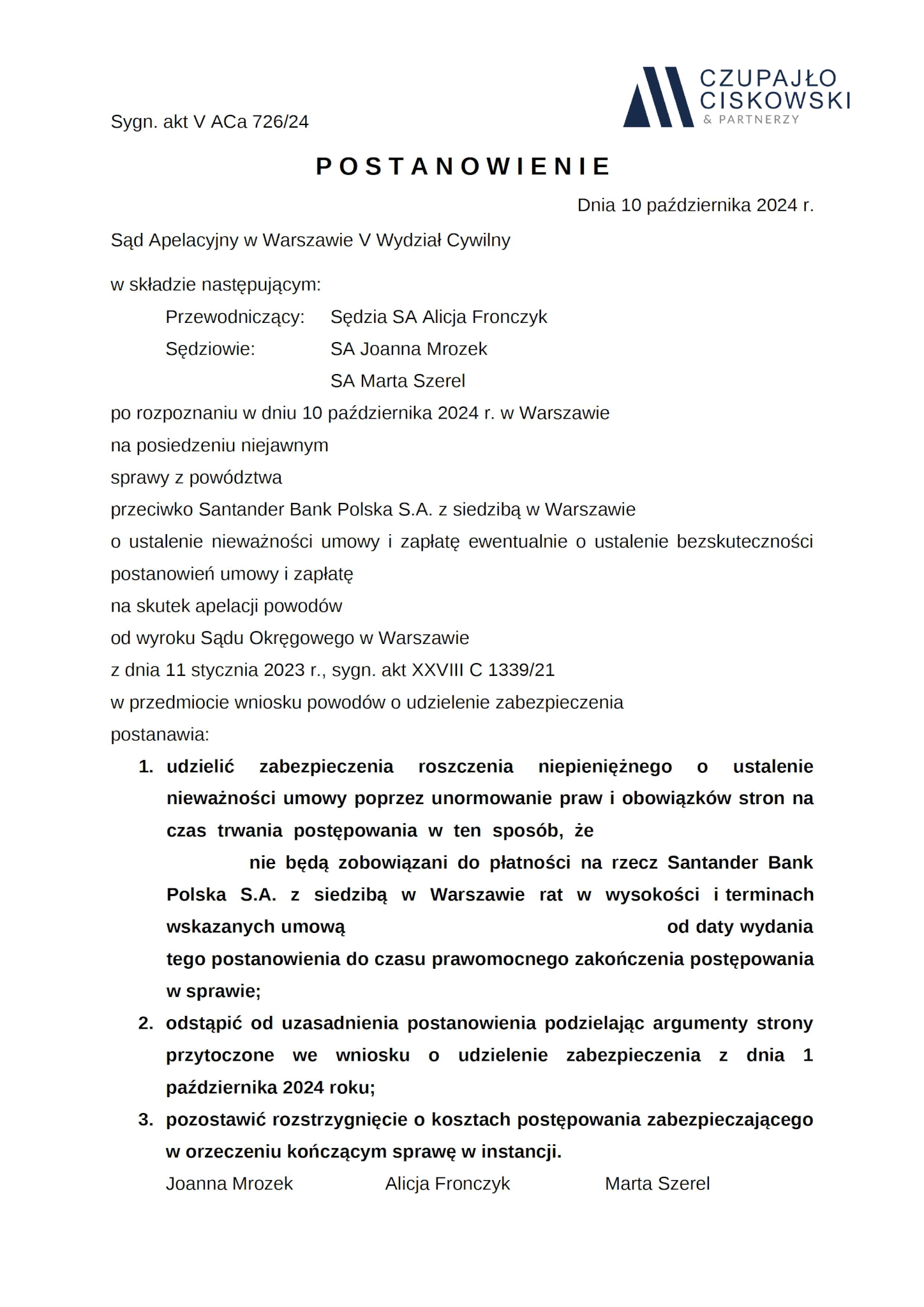 Sąd Apelacyjny w Warszawie, V Wydział Cywilny w składzie SA Alicja Fronczyk, SA Joanna Mrozek i SA Marta Szerel po rozpoznaniu na posiedzeniu niejawnym w dniu 10 października 2024 r. sprawy z powództwa naszych Klientów przeciwko Santander Bank Polska z siedzibą w Warszawie o ustalenie i zapłatę w sprawie o sygn. akt V ACa 726/24 postanowił udzielić zabezpieczenia roszczenia naszym Klientom.