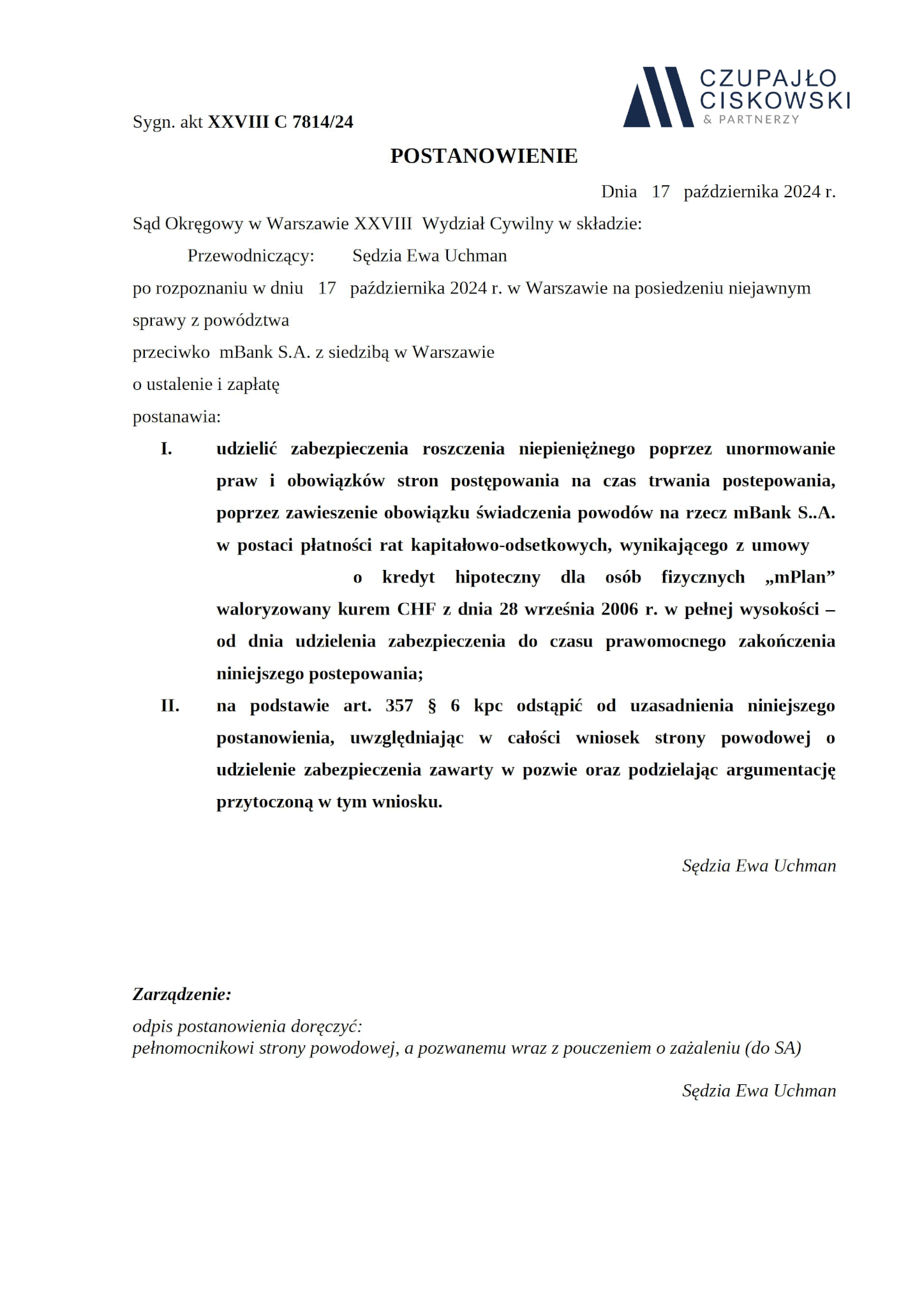 Sąd Okręgowy w Warszawie, XXVIII Wydział Cywilny w składzie Ewa Uchman po rozpoznaniu na posiedzeniu niejawnym w dniu 17 października 2024 r. sprawy z powództwa naszych Klientów przeciwko mBank S.A. z siedzibą w Warszawie o ustalenie i zapłatę w sprawie o sygn. akt XVIII C 7814/24 postanowił udzielić zabezpieczenia roszczenia naszym Klientom.
