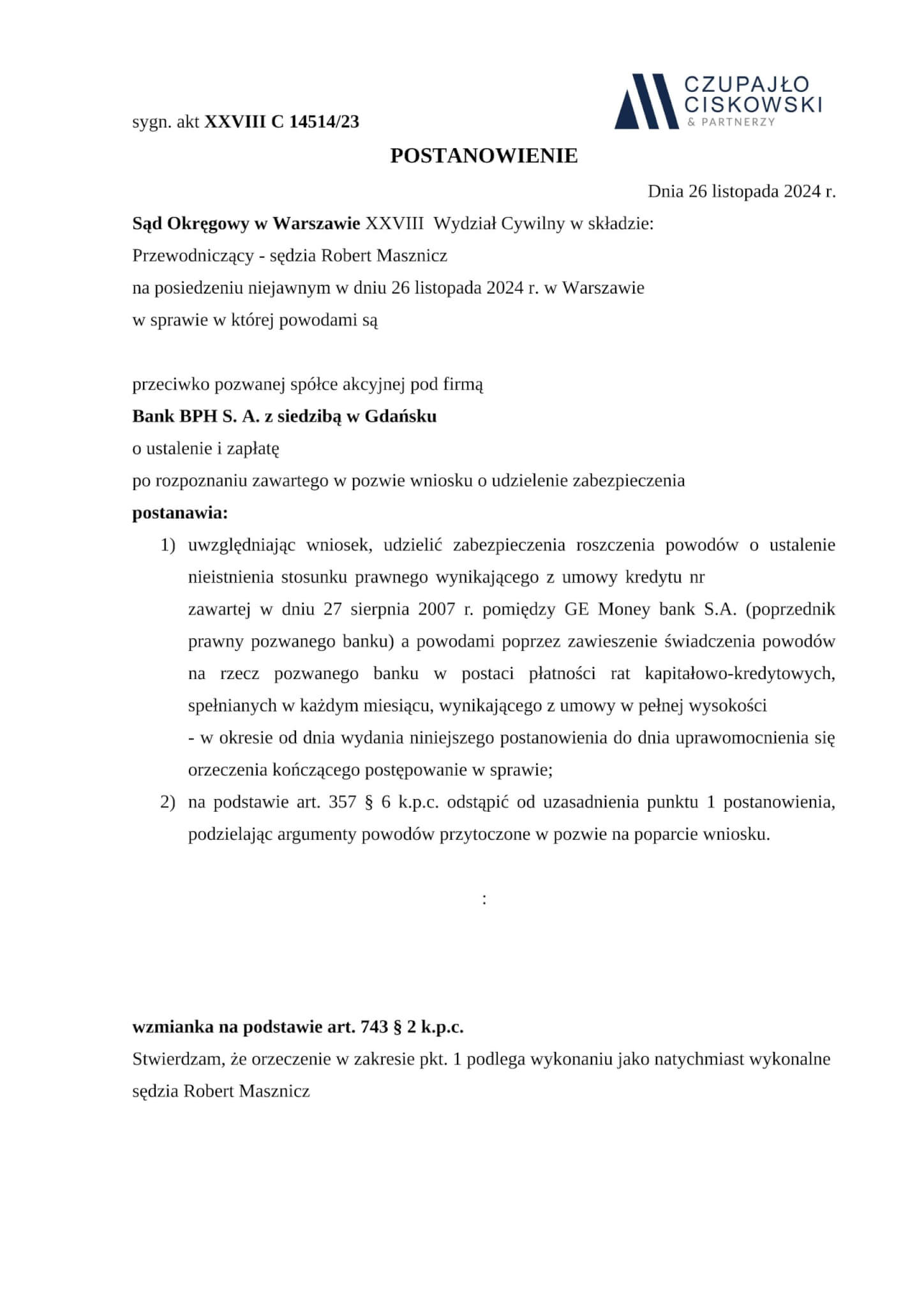 Sąd Okręgowy w Warszawie, XXVIII Wydział Cywilny po rozpoznaniu na posiedzeniu niejawnym w dniu 26 listopada 2024 r. sprawy z powództwa naszych klientów przeciwko Bankowi BPH S.A. z siedzibą w Gdańsku o ustalenie i zapłatę w sprawie o sygn. akt XXVIII C 14514/23 postanowił udzielić zabezpieczenia roszczenia naszych klientów.