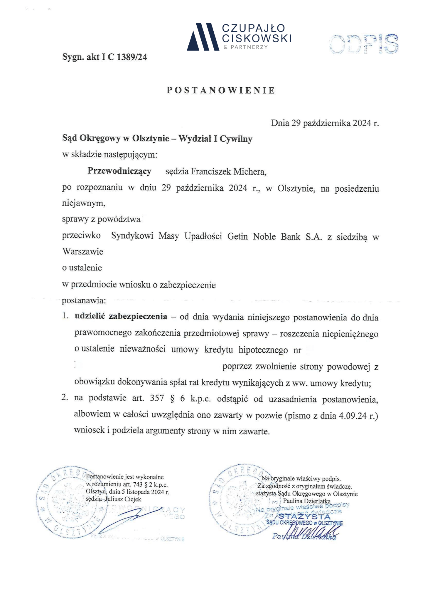 Sąd Okręgowy w Olsztynie, I Wydział Cywilny w składzie Przewodniczący: Sędzia Franciszek Michera po rozpoznaniu na posiedzeniu niejawnym w dniu 29 października 2024 r. sprawy z powództwa naszych Klientów przeciwko Syndykowi Masy Upadłości Getin Noble Bank S.A. z siedzibą w Warszawie o ustalenie w sprawie o sygn. akt I C 1389/24 postanowił udzielić zabezpieczenia roszczenia naszym klientom.