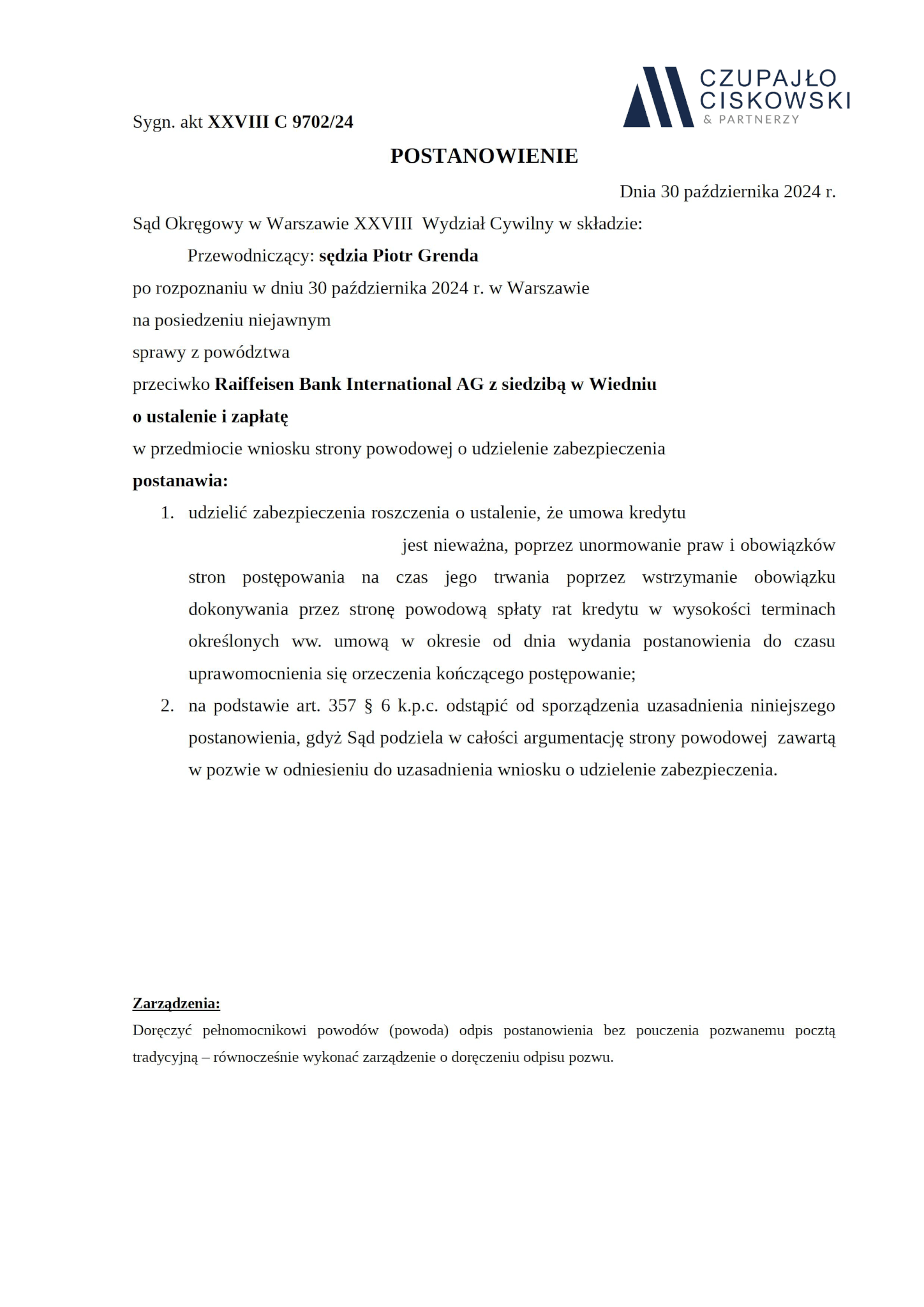 Sąd Okręgowy w Warszawie, XXVIII Wydział Cywilny w składzie sędzia Piotr Grenda po rozpoznaniu na posiedzeniu niejawnym w dniu 30 października 2024 r. sprawy z powództwa naszych Klientów przeciwko Raiffeisen Bank International AG z siedzibą w Wiedniu o ustalenie i zapłatę w sprawie o sygn. akt XXVII C 9702/24 postanowił udzielić zabezpieczenia roszczenia naszym Klientom.