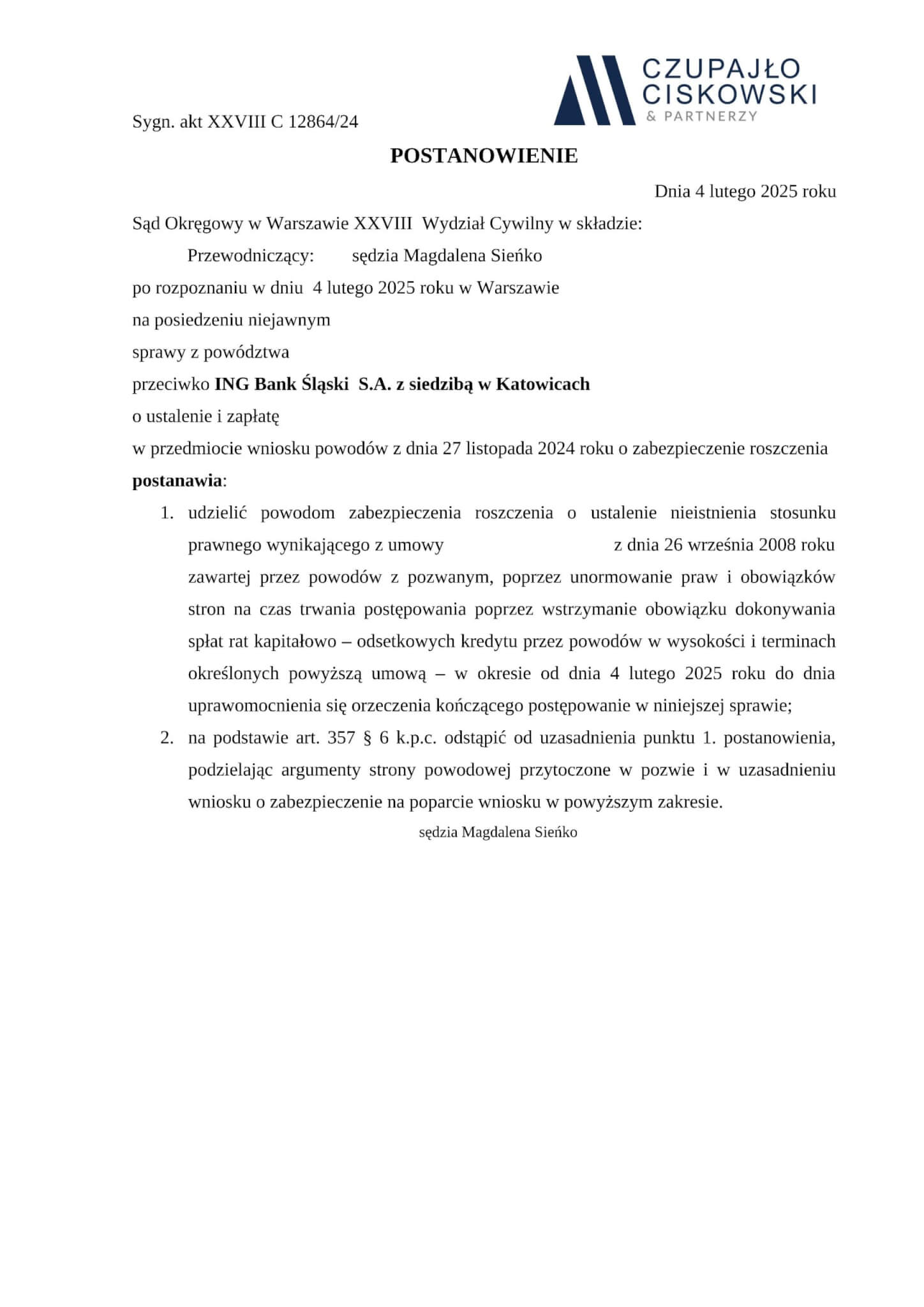 Sąd Okręgowy w Warszawie, XXVIII Wydział Cywilny w składzie SSO Magdaleny Sieńko po rozpoznaniu na posiedzeniu niejawnym w dniu 4 lutego 2025 r. sprawy z powództwa naszych klientów przeciwko ING Bank Śląski S.A. z siedzibą w Katowicach o ustalenie i zapłatę w sprawie o sygn. akt XXVIII C 12864/24 postanowił udzielić zabezpieczenia roszczenia naszych Klientów.