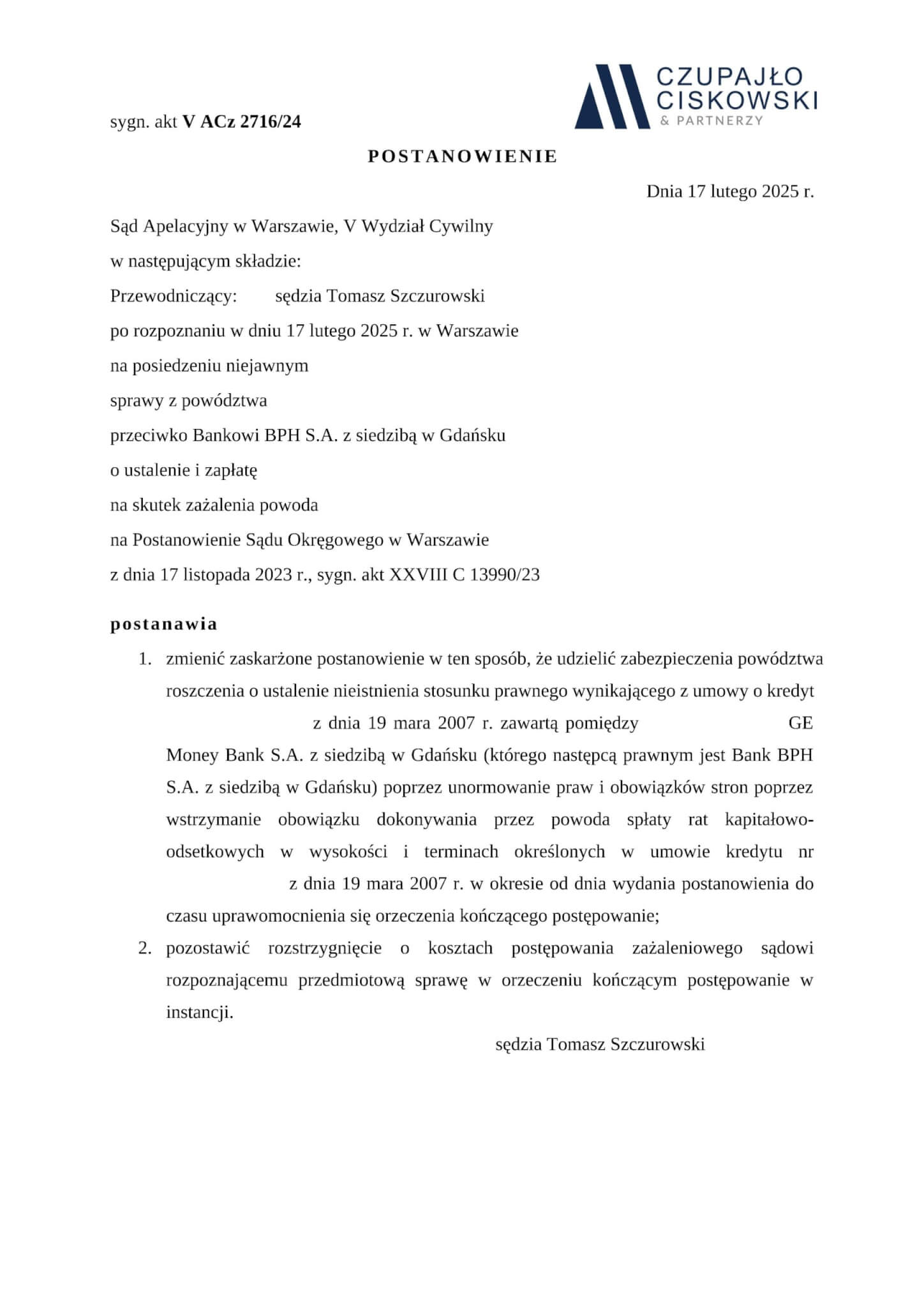 Sąd Apelacyjny w Warszawie, V Wydział Cywilny w składzie SSA Tomasza Szczurowskiego po rozpoznaniu na posiedzeniu niejawnym w dniu 17 lutego 2025 r. sprawy o sygn. akt V ACz 2786/24 z powództwa naszego klienta przeciwko Bankowi BPH S.A. z siedzibą w Gdańsku na skutek zażalenia Powoda na Postanowienie Sądu Okręgowego w Warszawie w sprawie o sygn. akt XXVIII C 13990/23 postanowił udzielić zabezpieczenia roszczenia naszego Klienta.