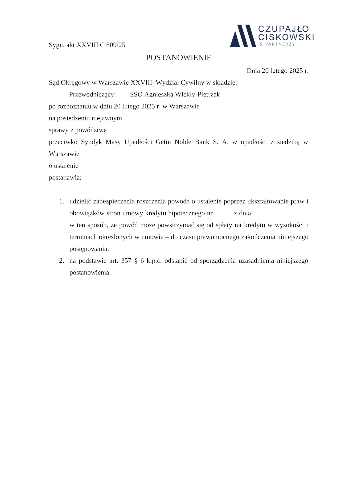 Sąd Okręgowy w Warszawie, XXVIII Wydział Cywilny w składzie SSO Agnieszka Wlekły-Pietrzak po rozpoznaniu na posiedzeniu niejawnym w dniu 20 lutego 2025 r. sprawy z powództwa naszego Klienta przeciwko Syndykowi Masy Upadłości Getin Noble Bank S.A. w upadłości o ustalenie w sprawie o sygn. akt XXVIII C 809/25 postanowił udzielić zabezpieczenia roszczenia naszemu Klientowi.