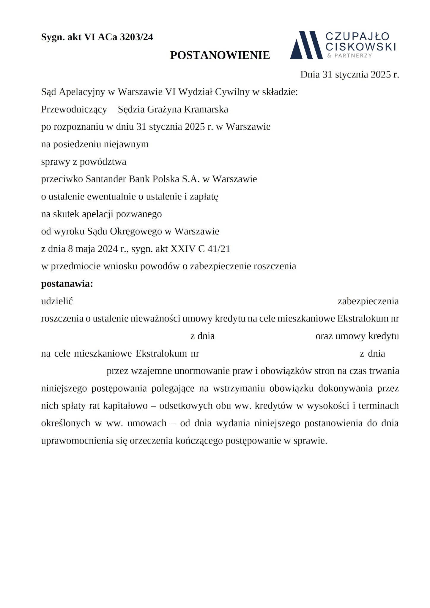 Sąd Apelacyjny w Warszawie, VI Wydział Cywilny w składzie SSO Grażyna Kramarska po rozpoznaniu na posiedzeniu niejawnym w dniu 31 stycznia 2025 r. sprawy z powództwa naszego Klienta przeciwko Santander Bank Polska Spółce Akcyjnej z siedzibą w Warszawie o ustalenie i zapłatę w sprawie o sygn. akt VI ACa 3203/24 postanowił udzielić zabezpieczenia roszczenia naszego Klienta.