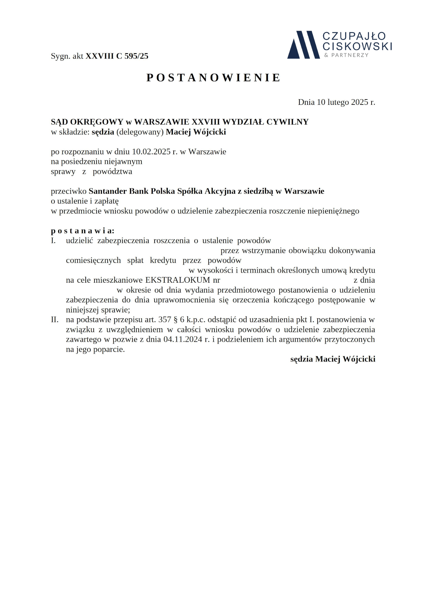 Sąd Okręgowy w Warszawie, XXVIII Wydział Cywilny w składzie sędzia Maciej Wójcicki po rozpoznaniu na posiedzeniu niejawnym w dniu 10 lutego 2025 r. sprawy z powództwa naszego Klienta przeciwko Santander Bank Polska Spółce Akcyjnej z siedzibą w Warszawie o ustalenie i zapłatę w sprawie o sygn. akt XXVIII C 595/25 postanowił udzielić zabezpieczenia roszczenia naszego Klienta.