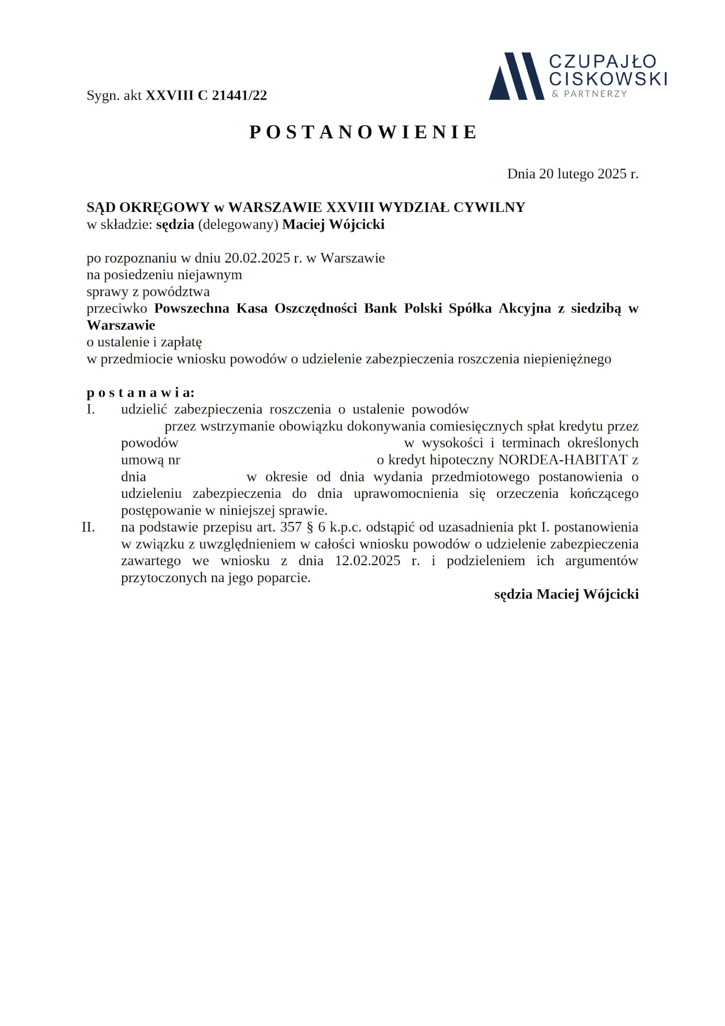 Sąd Okręgowy w Warszawie, XXVIII Wydział Cywilny w składzie sędzia Maciej Wójcicki po rozpoznaniu na posiedzeniu niejawnym w dniu 20 lutego 2025 r. sprawy z powództwa naszego Klienta przeciwko Powszechnej Kasie Oszczędności Bank Polska Spółce Akcyjnej z siedzibą w Warszawie o ustalenie i zapłatę w sprawie o sygn. akt XXVIII C 21441/22 postanowił udzielić zabezpieczenia roszczenia naszego Klienta.