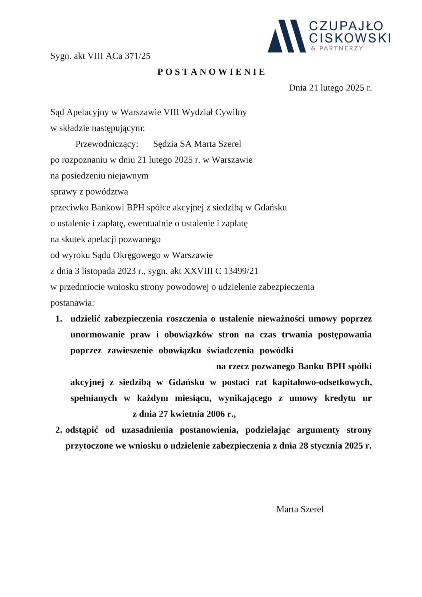 Sąd Apelacyjny w Warszawie, VIII Wydział Cywilny w składzie SSA Marty Szerel po rozpoznaniu na posiedzeniu niejawnym w dniu 21 lutego 2025 r. sprawy z powództwa naszej klientki przeciwko Bankowi BPH S.A. z siedzibą w Gdańsku w sprawie o sygn. akt VIII ACa 371/25 postanowił udzielić zabezpieczenia roszczenia naszej Klientce.