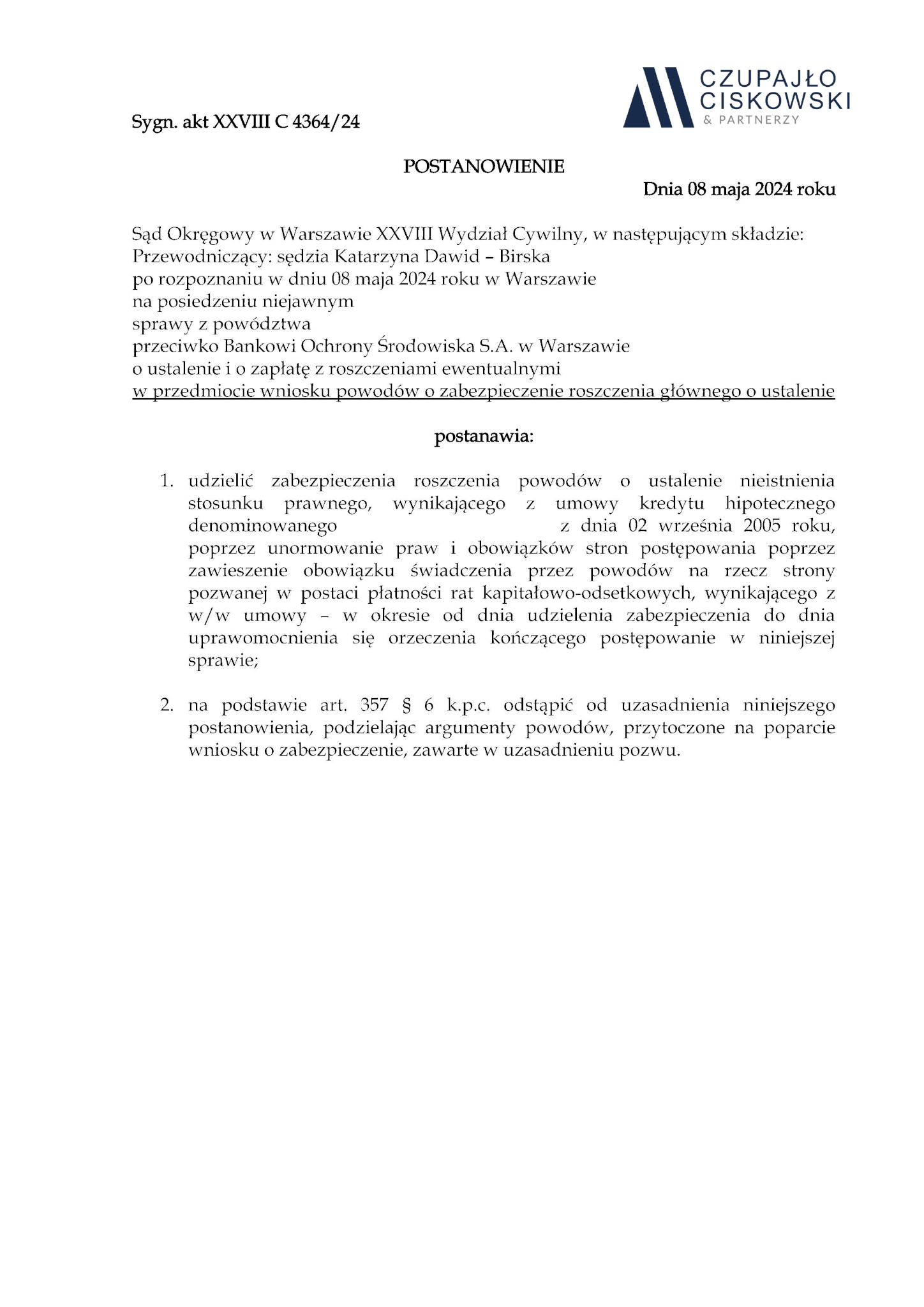 Sąd Okręgowy w Warszawie, XXVIII Wydział Cywilny w składzie sędzia Katarzyna Dawid-Birska postanowieniem z dnia 8 maja 2024 r. w sprawie przeciwko Bankowi Ochrony Środowiska S.A. z siedzibą w Warszawie prowadzonej pod sygn. akt XXVIII C 4364/24 postanowił udzielić zabezpieczenia roszczenia w ten sposób, że wstrzymał obowiązek uiszczania przez naszych Klientów rat kredytu do dnia prawomocnego zakończenia postępowania w sprawie. Sąd odstąpił od uzasadnienie postanowienia, podzielając w całości uzasadnienie wniosku wskazane w naszym pozwie.
