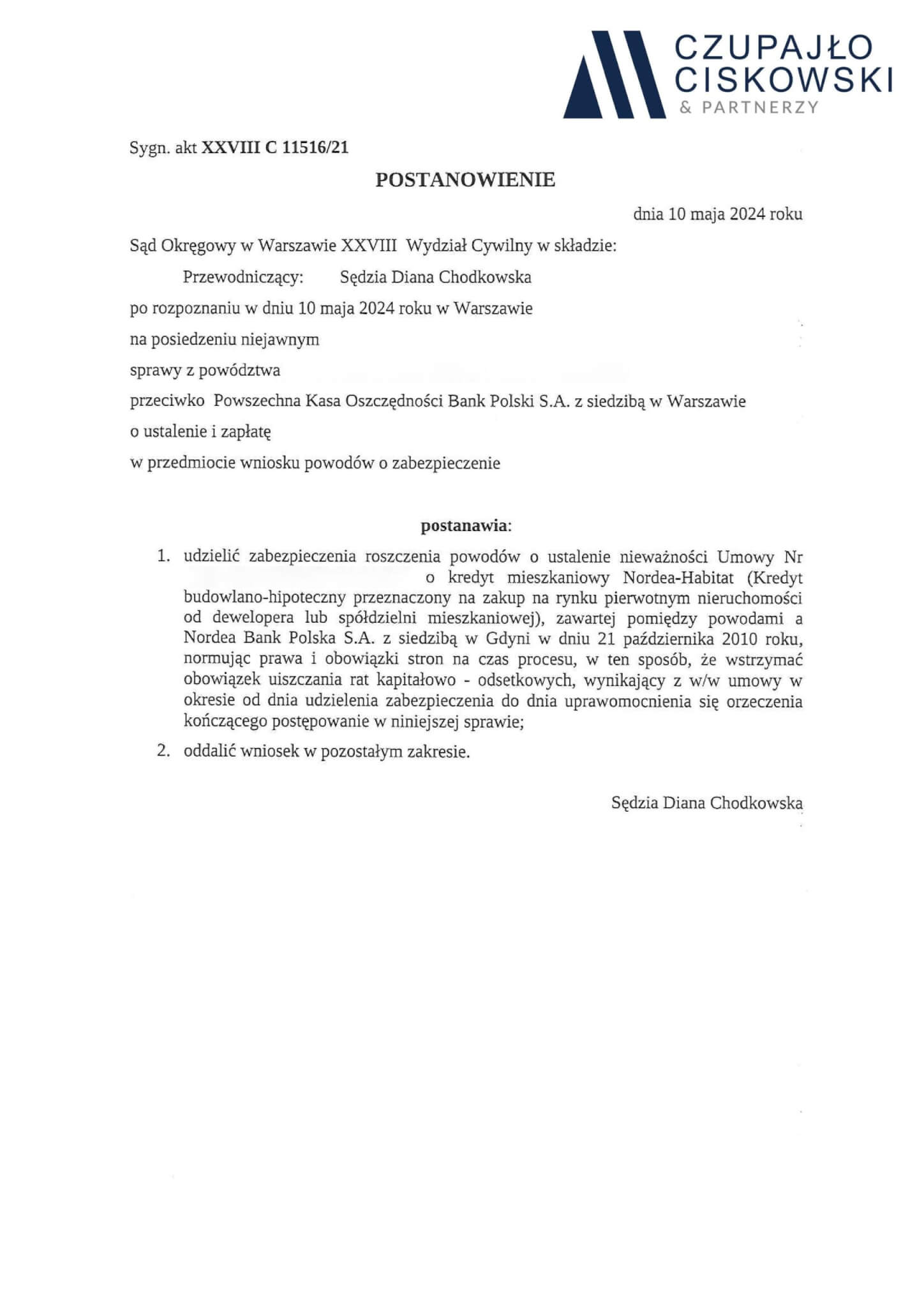 Sąd Okręgowy w Warszawie, XXVIII Wydział Cywilny w składzie SSO Diana Chodkowska po rozpoznaniu na posiedzeniu niejawnym w dniu 10 maja 2024 r. sprawy z powództwa naszych Klientów przeciwko Powszechna Kasa Oszczędności Bank Polski S.A. o ustalenie i zapłatę o sygn. akt XXVIII C 11516/21 postanowił udzielić zabezpieczenia roszczenia naszych Klientów.