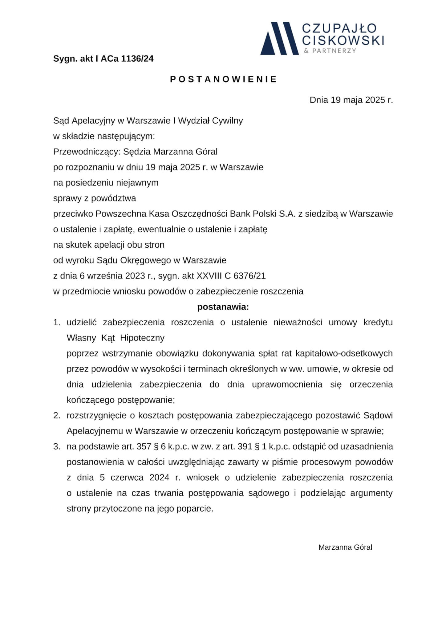 Sąd Apelacyjny w Warszawie, I Wydział Cywilny w składzie SSA Marzeny Góral po rozpoznaniu na posiedzeniu niejawnym w dniu 19 maja 2025 r. na skutek apelacji w sprawie z powództwa naszych Klientów przeciwko Powszechnej Kasie Oszczędności Bankowi Polskiemu S.A. z siedzibą w Warszawie w sprawie o sygn. akt I ACa 1136/24 postanowił udzielić zabezpieczenia roszczenia naszym Klientom.