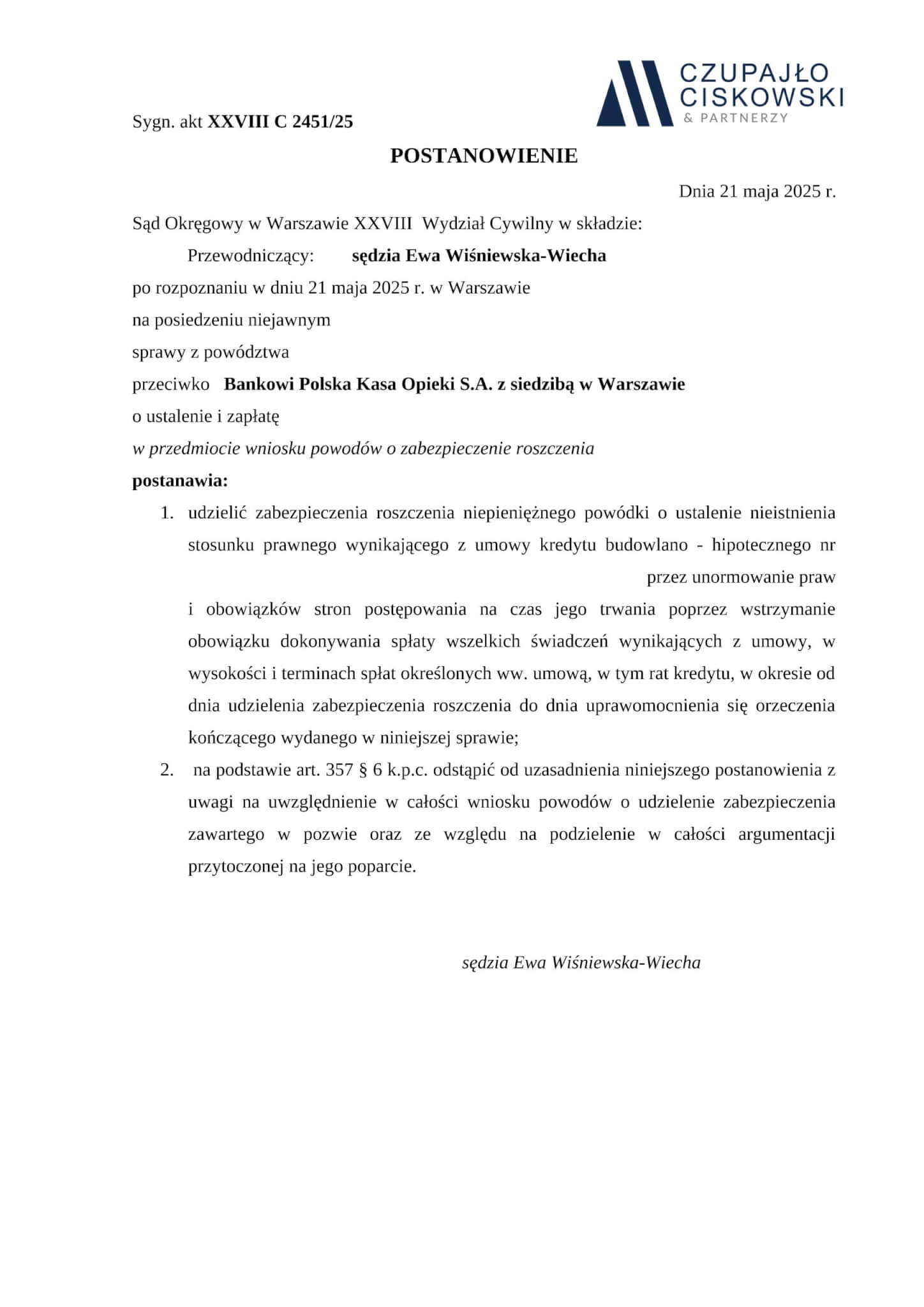Sąd Okręgowy w Warszawie, XXVIII Wydział Cywilny w składzie SSO Ewa Wiśniewska-Wiecha po rozpoznaniu na posiedzeniu niejawnym w dniu 21 maja 2025 r. sprawy z powództwa naszych Klientów przeciwko Bankowi Polska Kasa Opieki S.A. z siedzibą w Warszawie o ustalenie i zapłatę w sprawie o sygn. akt XXVIII C 2451/25 postanowił udzielić zabezpieczenia roszczenia naszym Klientom.