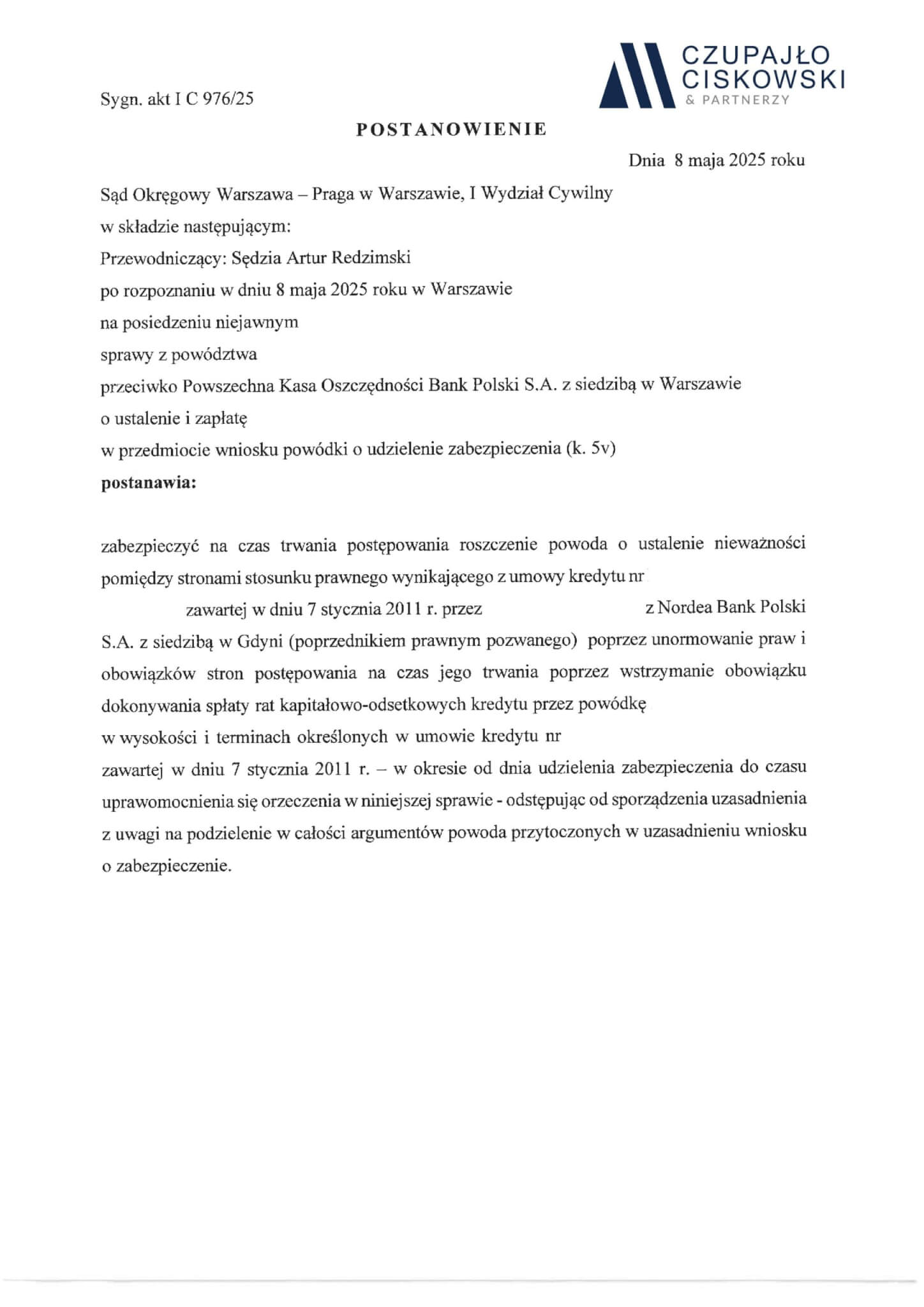 Sąd Okręgowy Warszawa-Praga w Warszawie, I Wydział Cywilny w składzie SSO Artur Redzimski po rozpoznaniu na posiedzeniu niejawnym w dniu 8 maja 2025 r. sprawy z powództwa naszej Klientki przeciwko Powszechnej Kasie Oszczędności Bankowi Polskiemu S.A. z siedzibą w Warszawie o ustalenie i zapłatę w sprawie o sygn. akt I C 976/25 postanowił udzielić zabezpieczenia roszczenia naszej Klientce.