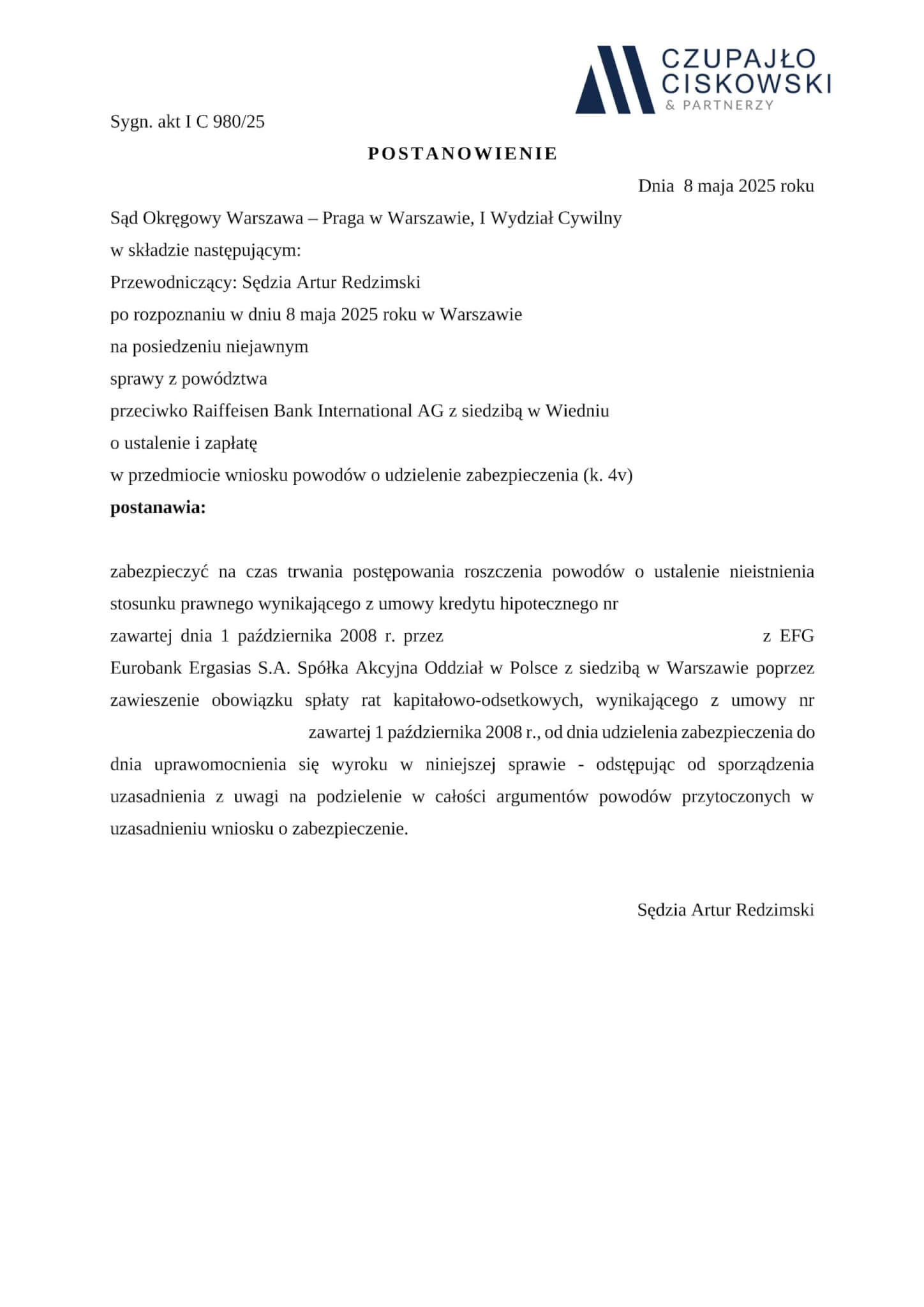 Sąd Okręgowy Warszawa-Praga w Warszawie, I Wydział Cywilny w składzie SSO Artur Redzimski po rozpoznaniu na posiedzeniu niejawnym w dniu 8 maja 2025 r. sprawy z powództwa naszych Klientów przeciwko Raiffeisen Bank International AG z siedzibą w Wiedniu o ustalenie i zapłatę w sprawie o sygn. akt I C 980/25 postanowił udzielić zabezpieczenia roszczenia naszym Klientom.