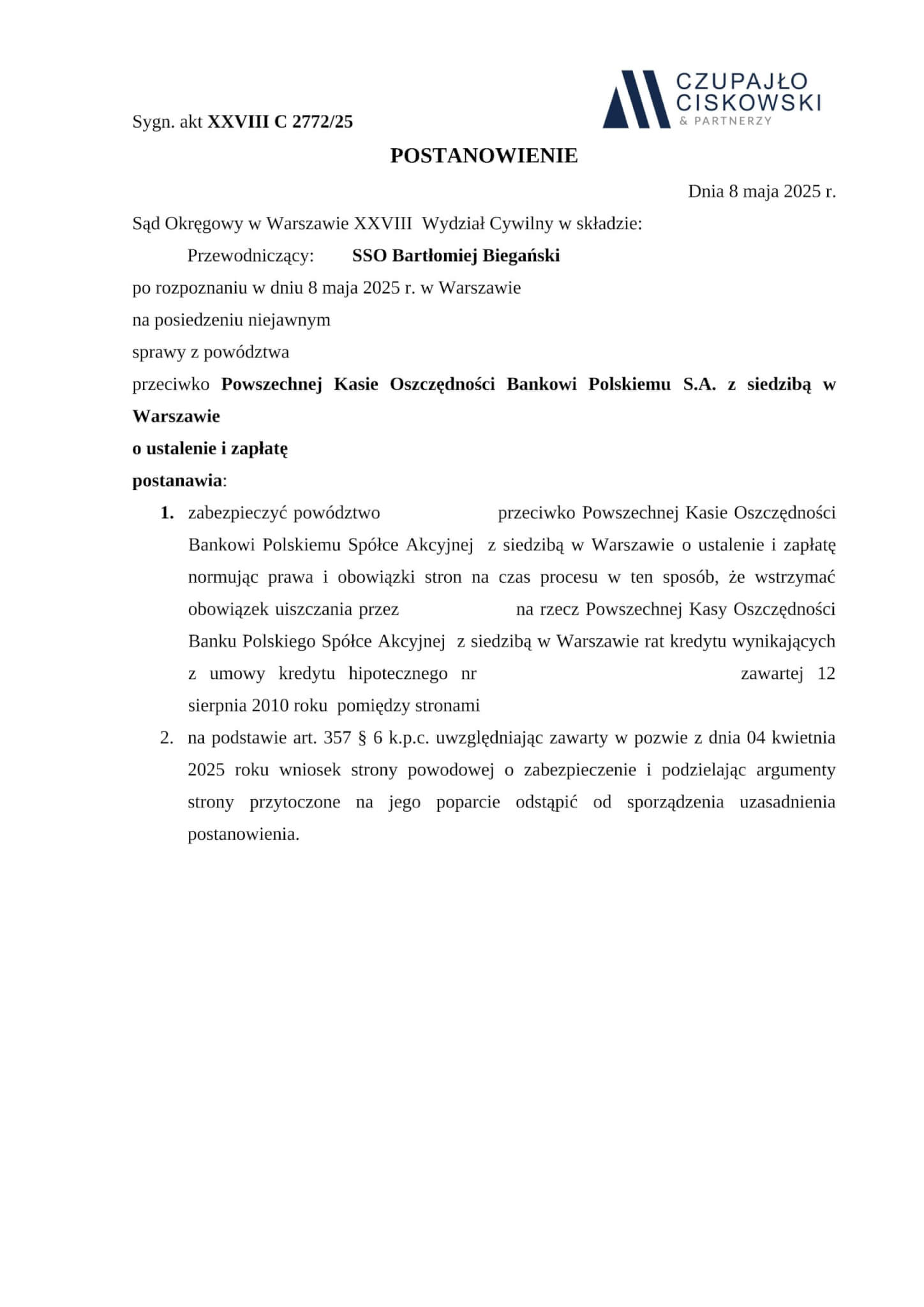 Sąd Okręgowy w Warszawie, XXVIII Wydział Cywilny w składzie SSO Bartłomiej Biegański po rozpoznaniu na posiedzeniu niejawnym w dniu 8 maja 2025 r. sprawy z powództwa naszej Klientki przeciwko Powszechnej Kasie Oszczędności Bankowi Polskiemu S.A. z siedzibą w Warszawie o ustalenie i zapłatę w sprawie o sygn. akt XXVIII C 2772/25 postanowił udzielić zabezpieczenia roszczenia naszej Klientce.