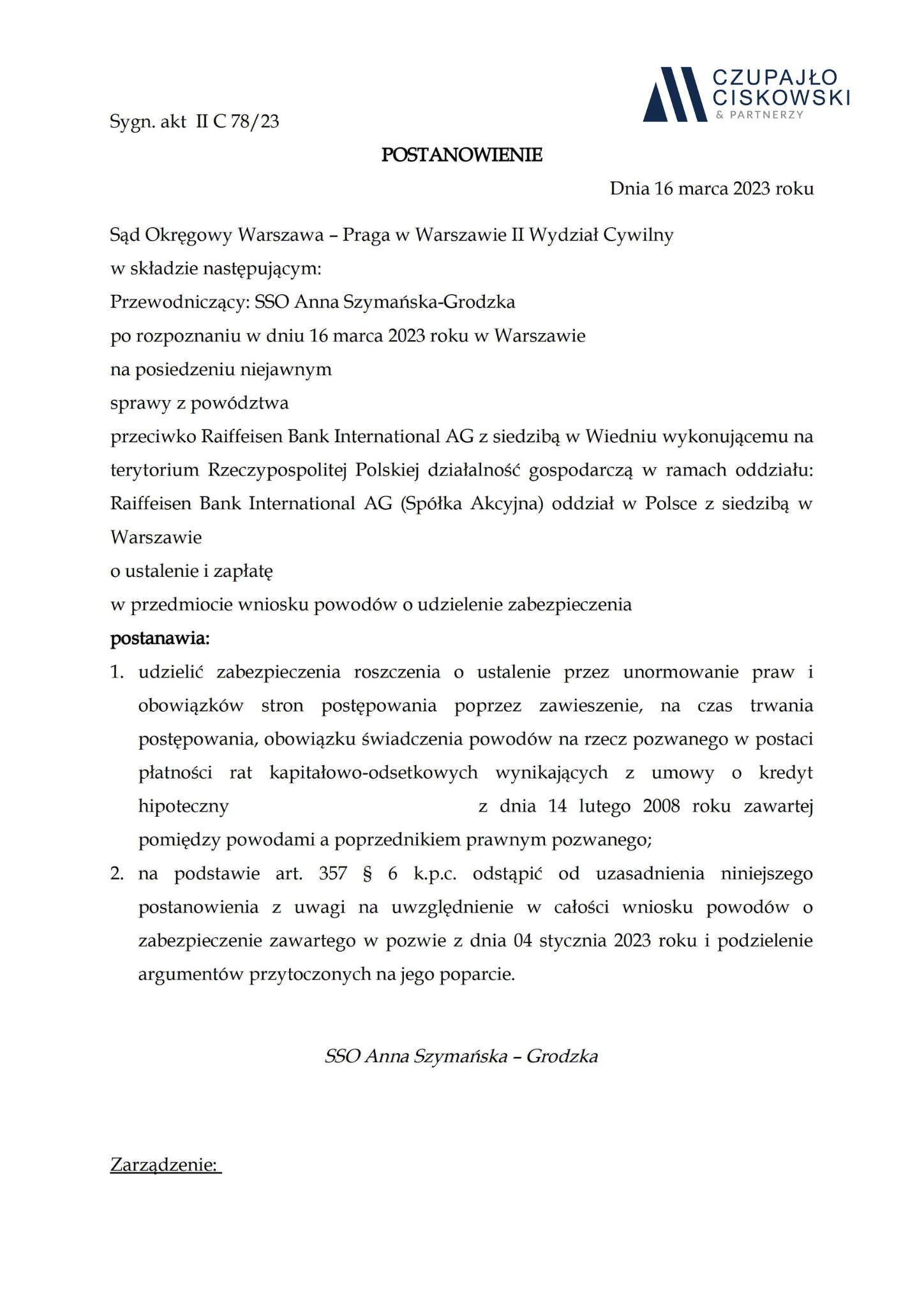 Sąd Okręgowy Warszawa-Praga w Warszawie, II Wydział Cywilny w składzie SSO Anna Szymańska-Grodzka po rozpoznaniu w dniu 16 marca 2023 r. na posiedzeniu niejawnym sprawy z powództwa naszych Klientów przeciwko Raiffeisen Bank International AG z siedzibą w Wiedniu o ustalenie i zapłatę w sprawie o sygn. akt II C 78/23 postanowił udzielić zabezpieczenia roszczenia naszym Klientom.