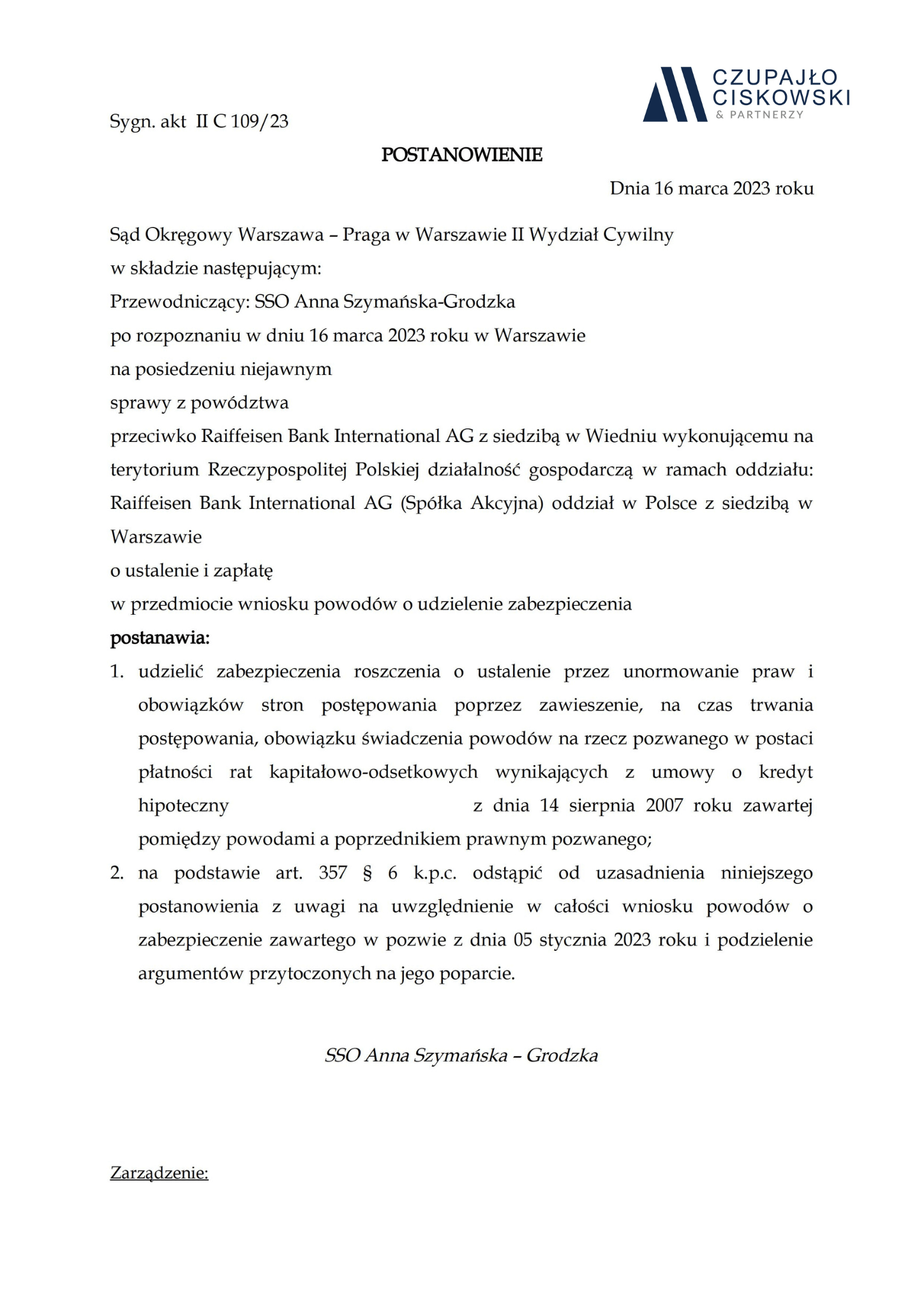 Sąd Okręgowy Warszawa-Praga w Warszawie, II Wydział Cywilny w składzie SSO Anna Szymańska-Grodzka po rozpoznaniu w dniu 16 marca 2023 r. na posiedzeniu niejawnym sprawy z powództwa naszych Klientów przeciwko Raiffeisen Bank International AG z siedzibą w Wiedniu o ustalenie i zapłatę w sprawie o sygn. akt II C 109/23 postanowił udzielić zabezpieczenia roszczenia naszym Klientom.