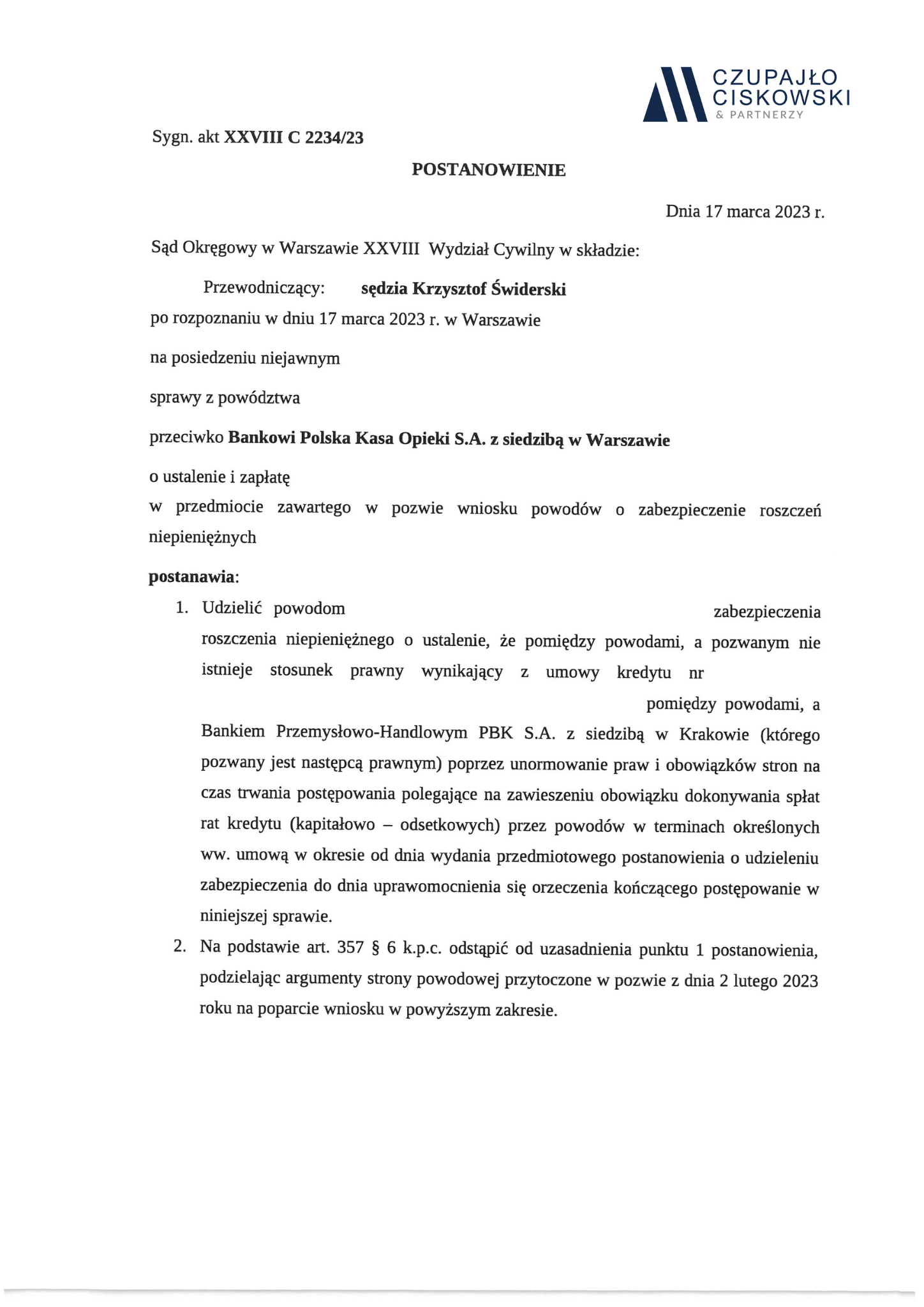 Sąd Okręgowy w Warszawie w składzie SSO Krzysztof Świderski po rozpoznaniu w dniu 17 marca 2023 r. na posiedzeniu niejawnym sprawy z powództwa naszych Klientów przeciwko Bankowi Polska Kasa Opieki S.A. o ustalenie i zapłatę w sprawie o sygn. akt XXVIII C 2234/23 postanowił udzielić zabezpieczenia roszczenia naszym Klientom.