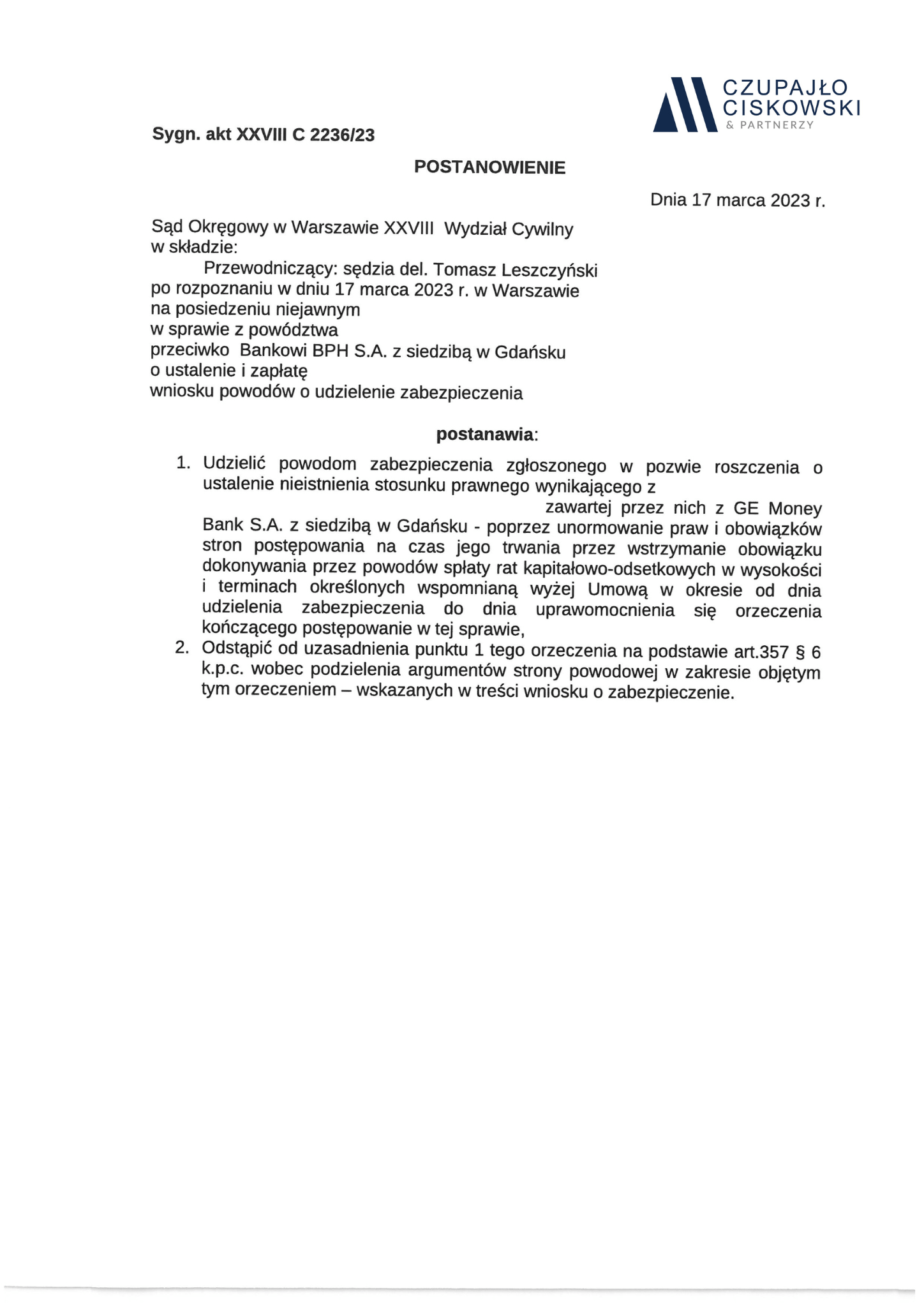 Sąd Okręgowy w Warszawie w składzie SSR del. Tomasz Leszczyński po rozpoznaniu w dniu 17 marca 2023 r. na posiedzeniu niejawnym sprawy z powództwa naszych Klientów przeciwko Bankowi BPH S.A. o ustalenie i zapłatę w sprawie o sygn. akt XXVIII C 2236/23 postanowił udzielić zabezpieczenia roszczenia naszym Klientom.