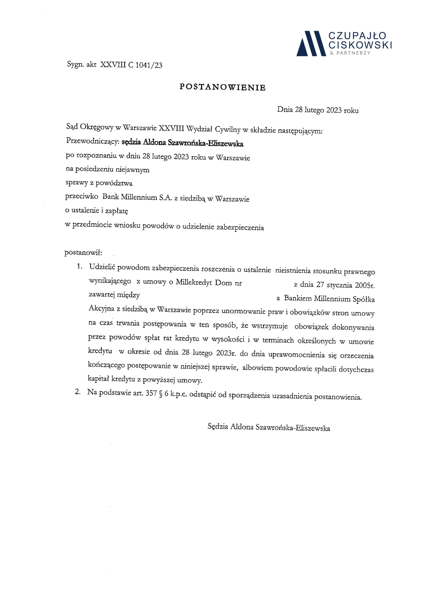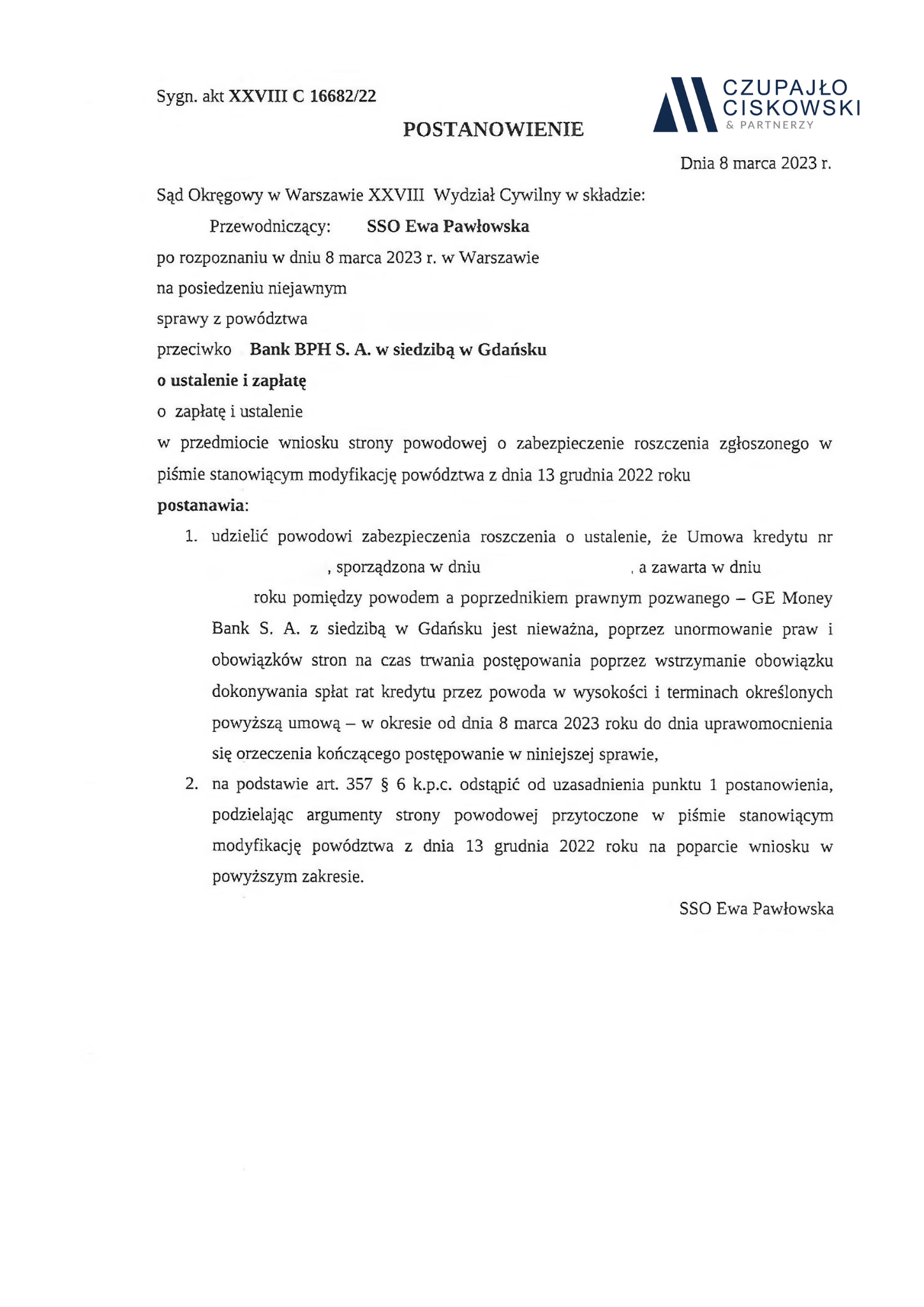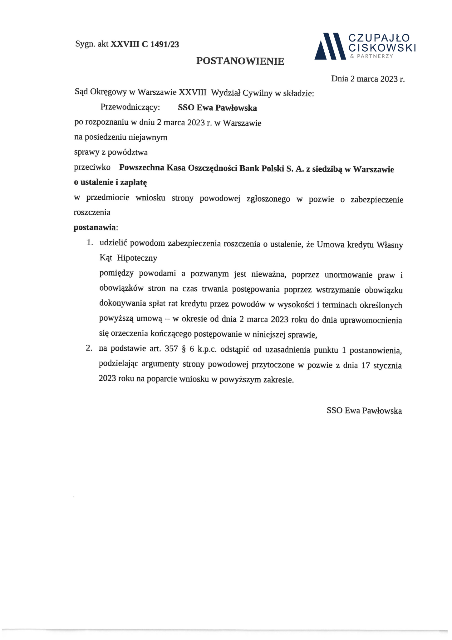 Sąd Okręgowy w Warszawie w składzie SSO Ewa Pawłowska po rozpoznaniu w dniu 2 marca 2023 r. na posiedzeniu niejawnym sprawy z powództwa naszych Klientów przeciwko Powszechnej Kasie Oszczędności Bank Polski S.A. o ustalenie i zapłatę w sprawie o sygn. akt XXVIII C 1491/23 postanowił udzielić zabezpieczenia roszczenia naszym Klientom.