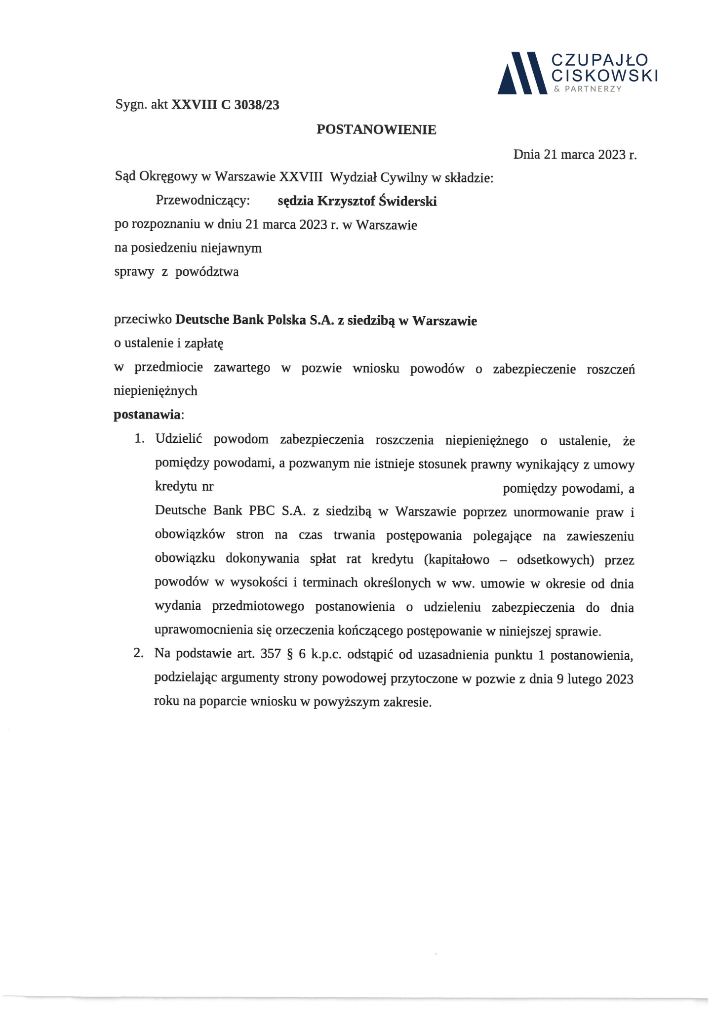Sąd Okręgowy w Warszawie w składzie SSO Krzysztof Świderski po rozpoznaniu w dniu 21 marca 2023 r. na posiedzeniu niejawnym sprawy z powództwa naszych Klientów przeciwko Deutsche Bank Polska S.A. o ustalenie i zapłatę w sprawie o sygn. akt XXVIII C 3038/23 postanowił udzielić zabezpieczenia roszczenia naszym Klientom.