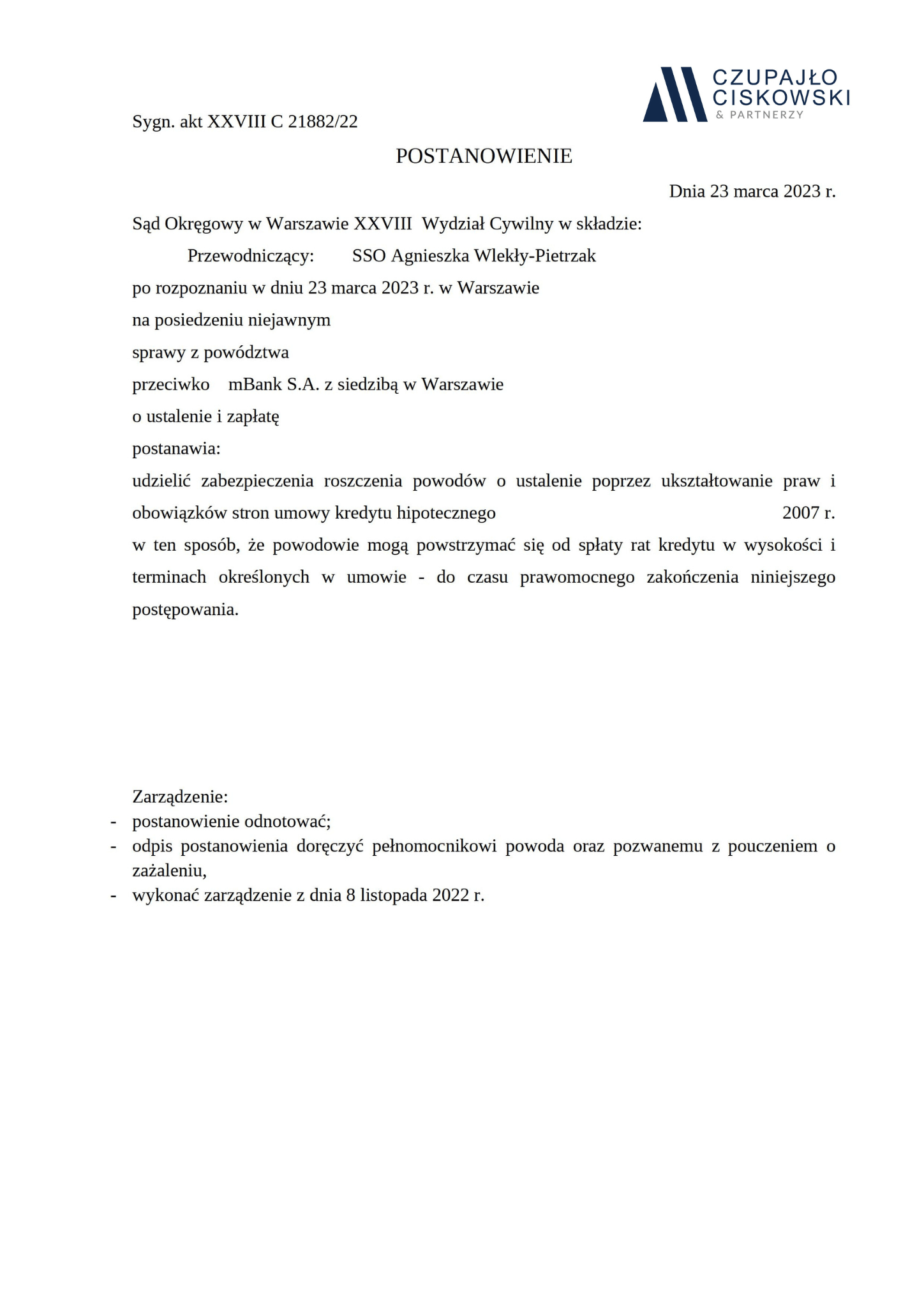 Sąd Okręgowy w Warszawie, XXVIII Wydział Cywilny w składzie SSO Agnieszka Wlekły-Pietrzak po rozpoznaniu w dniu 23 marca 2023 r. na posiedzeniu niejawnym sprawy z powództwa naszych Klientów przeciwko mBank S.A. z siedzibą w Warszawie o ustalenie i zapłatę w sprawie o sygn. akt XXVIII C 21882/22 postanowił udzielić zabezpieczenia roszczenia naszym Klientom.