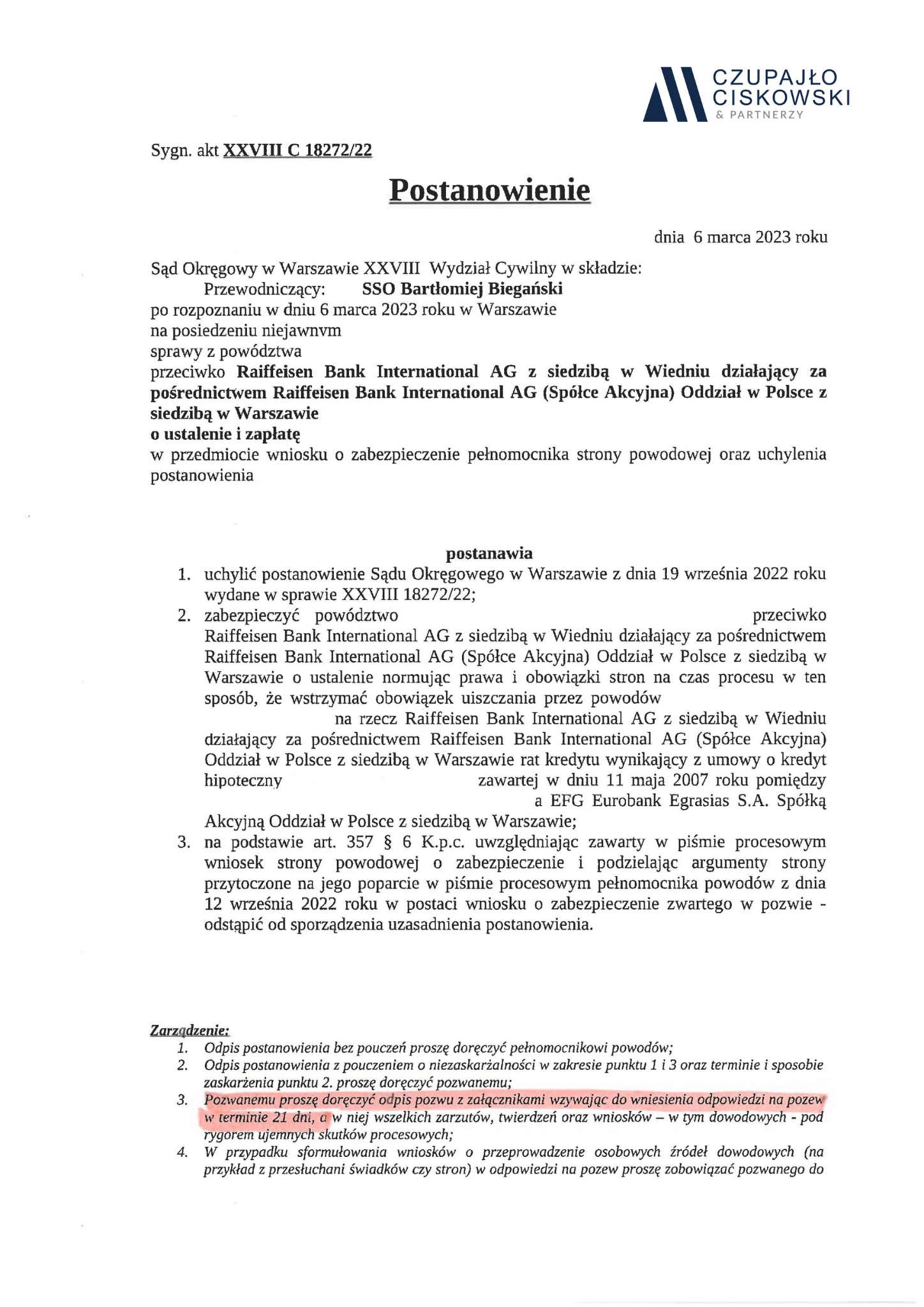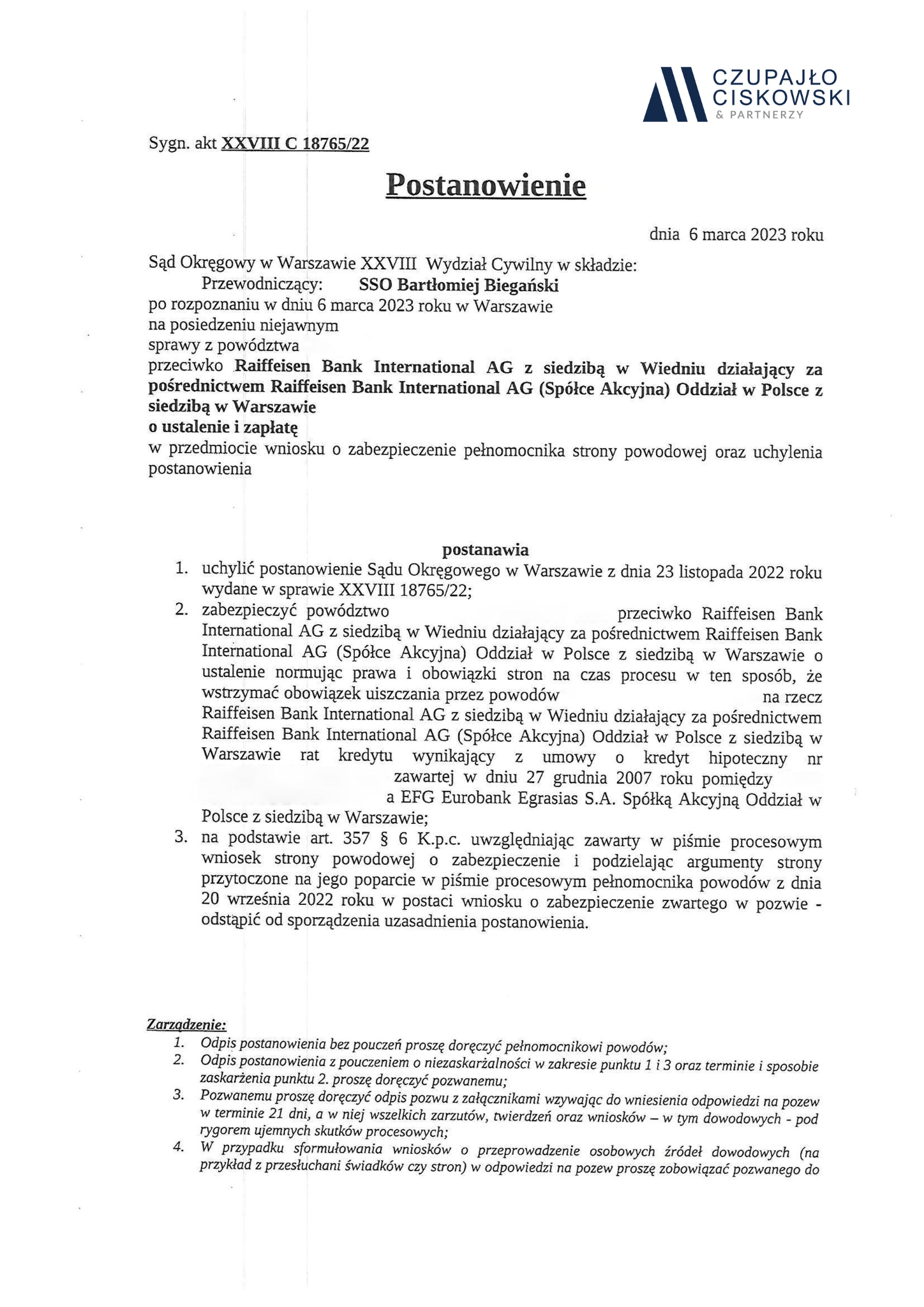 Sąd Okręgowy w Warszawie, XXVIII Wydział Cywilny w składzie SSO Bartłomiej Biegański po rozpoznaniu w dniu 6 marca 2023 r. na posiedzeniu niejawnym sprawy z powództwa naszych Klientów przeciwko Raiffeisen Bank International AG z siedzibą w Wiedniu o ustalenie i zapłatę w sprawie o sygn. akt XXVIII C 18765/22 postanowił udzielić zabezpieczenia roszczenia naszym Klientom.
