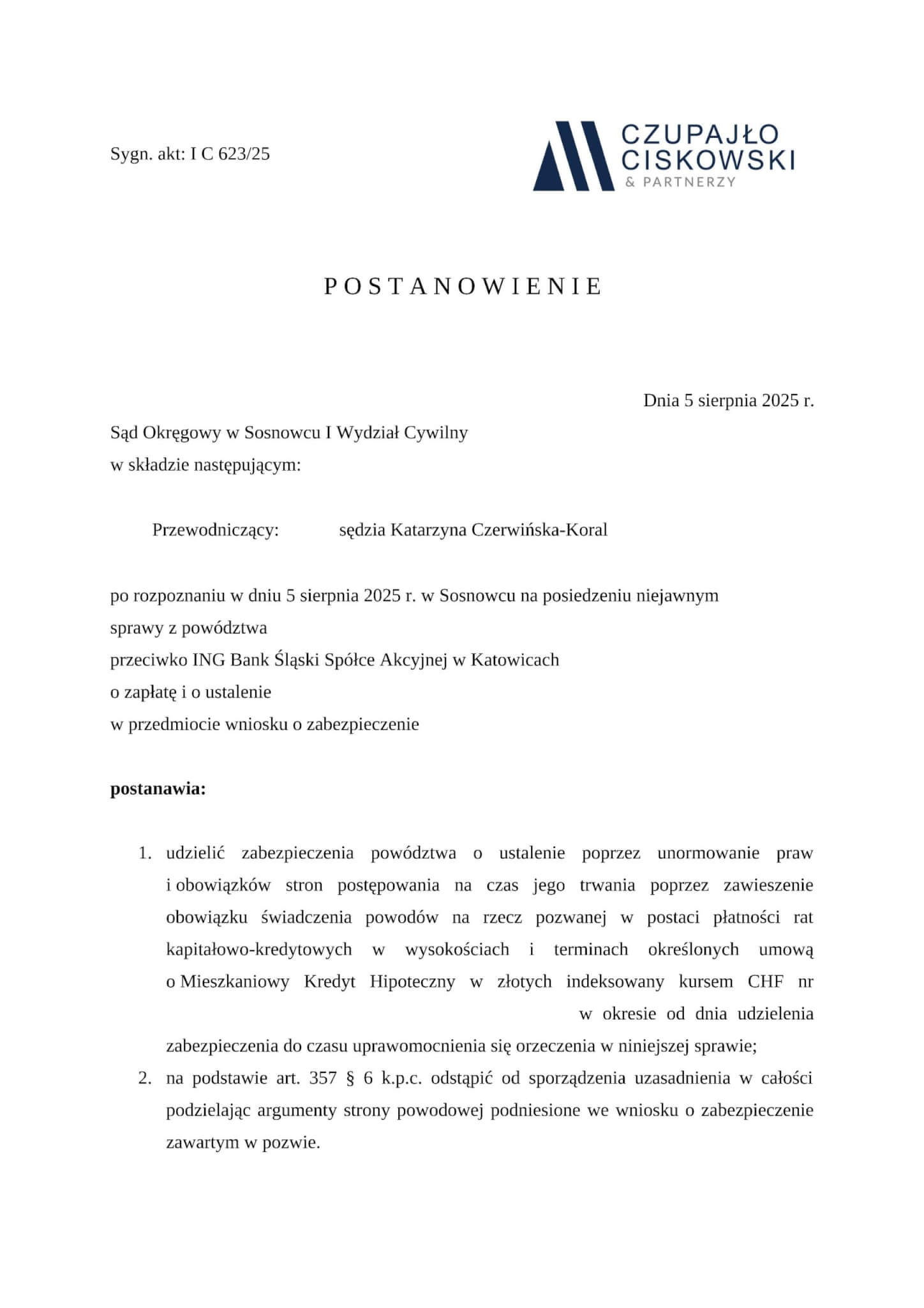 Sąd Okręgowy w Sosnowcu, I Wydział Cywilny w składzie sędzi Katarzyny Czerwińskiej-Koral po rozpoznaniu na posiedzeniu niejawnym w dniu 5 sierpnia 2025 r. sprawy z powództwa naszego Klienta przeciwko ING Bank Śląski Spółce Akcyjnej w Katowicach o ustalenie i zapłatę w sprawie o sygn. akt I C 623/25 postanowił udzielić zabezpieczenia roszczenia naszemu Klientowi.