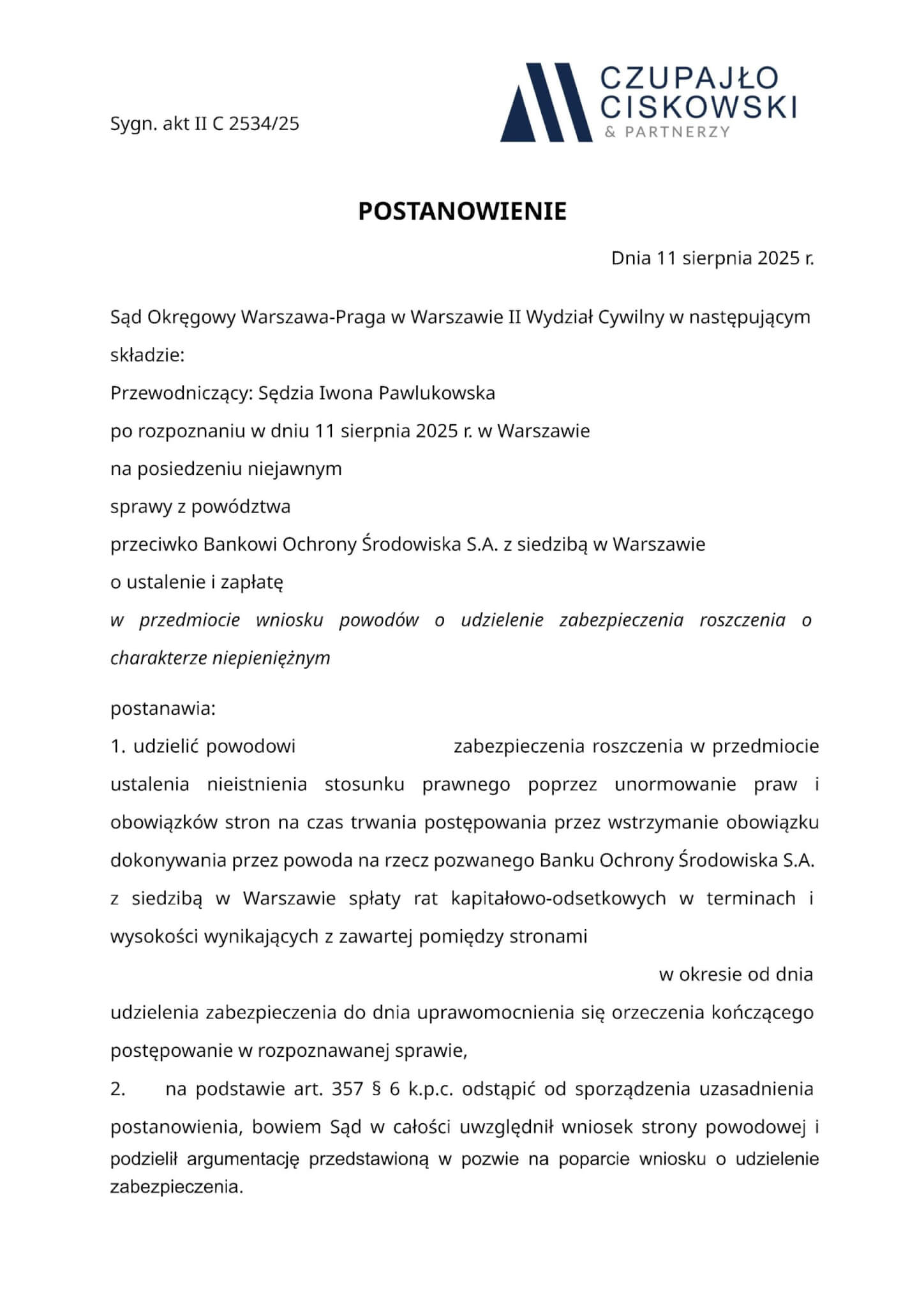 Sąd Okręgowy Warszawa-Praga w Warszawie II Wydział Cywilny w składzie sędzi Iwony Pawlukowskiej po rozpoznaniu na posiedzeniu niejawnym w dniu 11 sierpnia 2025 r. sprawy z powództwa naszego Klienta przeciwko Bankowi Ochrony Środowiska S.A. z siedzibą w Warszawie o ustalenie i zapłatę w sprawie o sygn. akt II C 2534/25 postanowił udzielić zabezpieczenia roszczenia naszemu Klientowi.