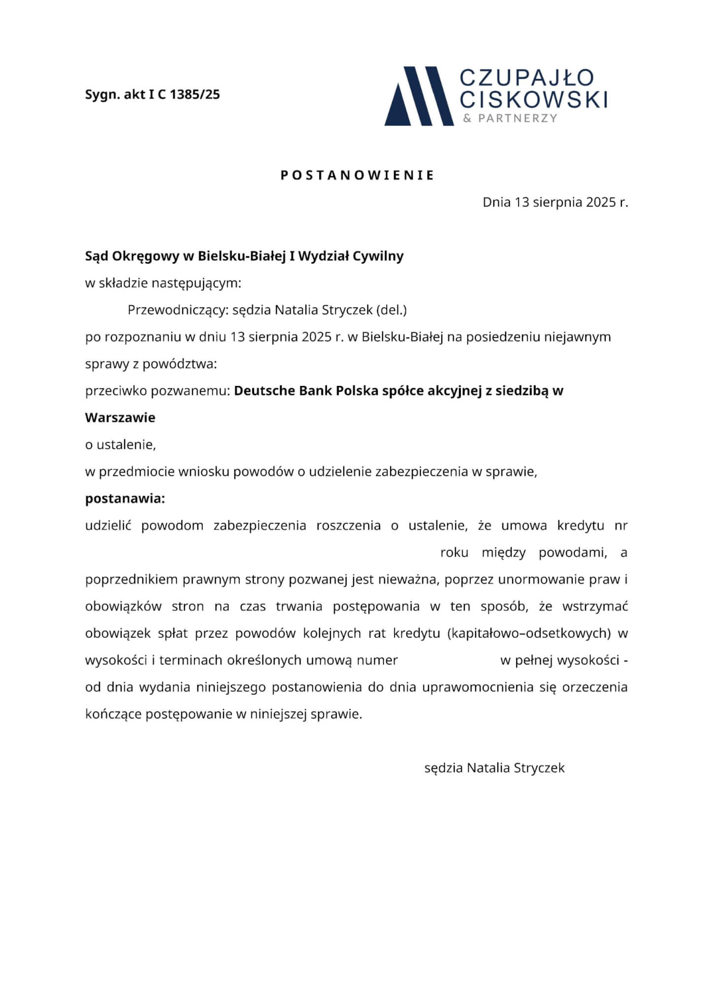 Sąd Okręgowy w Bielsku-Białej I Wydział Cywilny w składzie sędzi Natalii Stryczek po rozpoznaniu na posiedzeniu niejawnym w dniu 13 sierpnia 2025 r. sprawy z powództwa naszych Klientów przeciwko Deutsche Bank Polska spółce akcyjnej z siedzibą w Warszawie o ustalenie, w sprawie o sygn. akt I C 1385/25 postanowił udzielić zabezpieczenia roszczenia naszym Klientom.